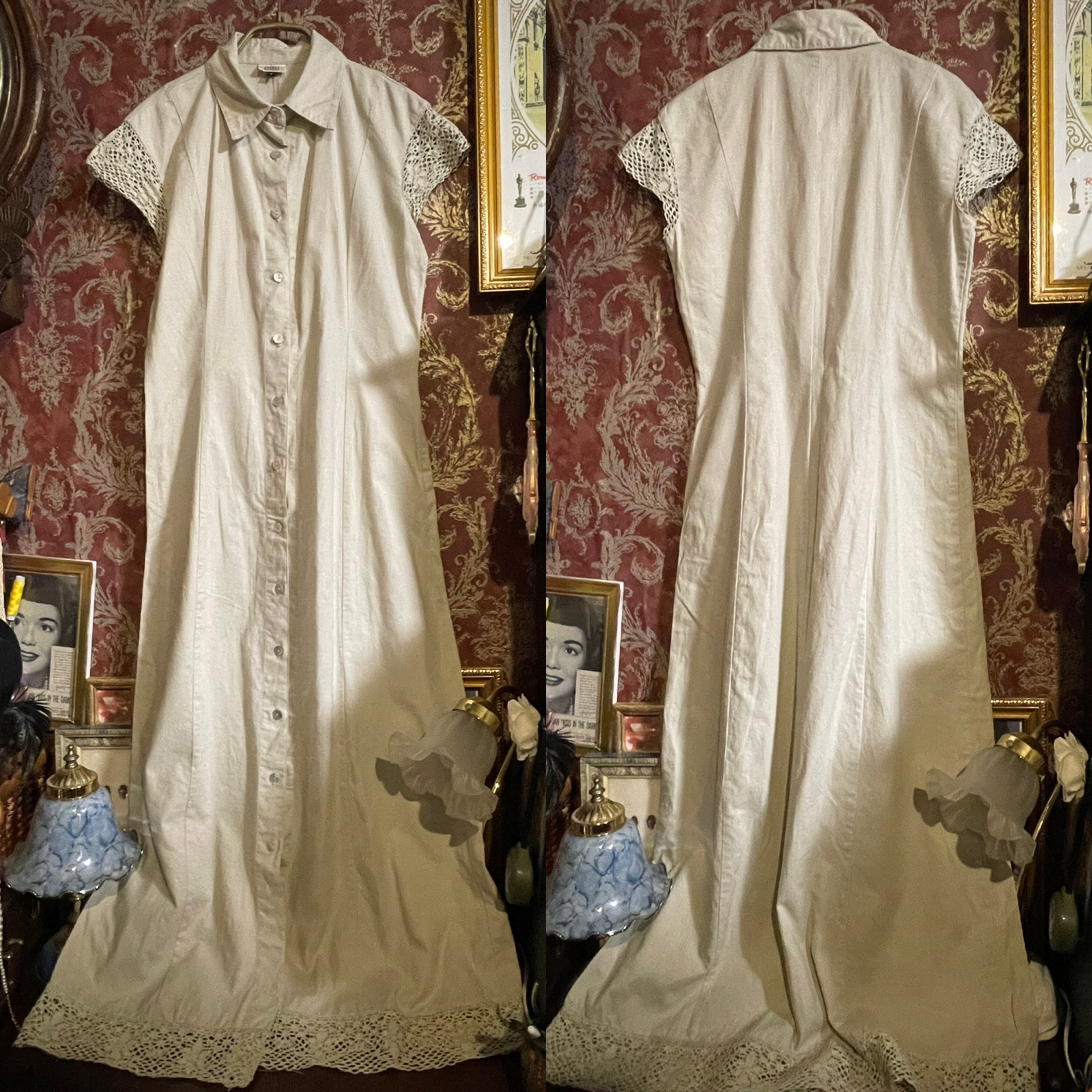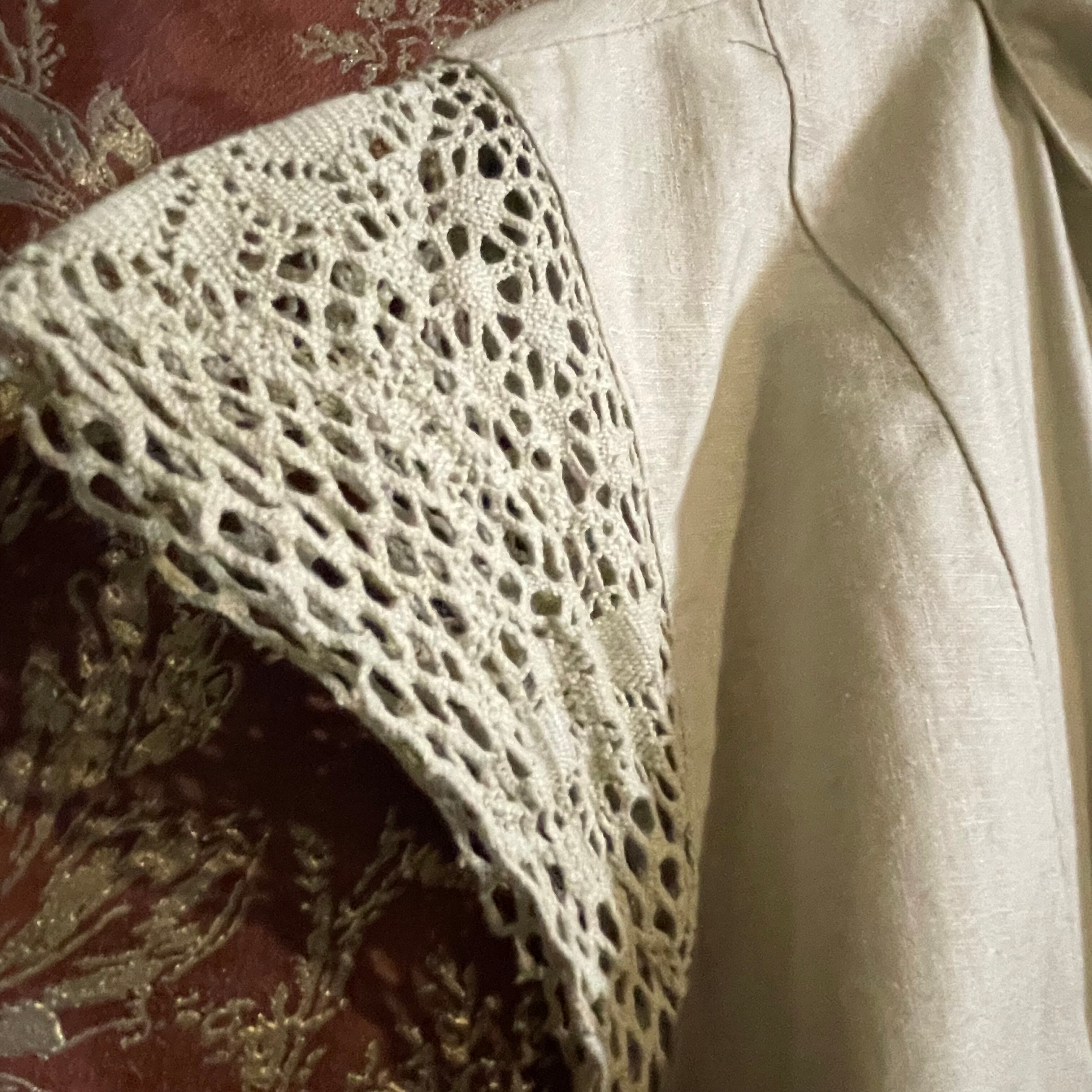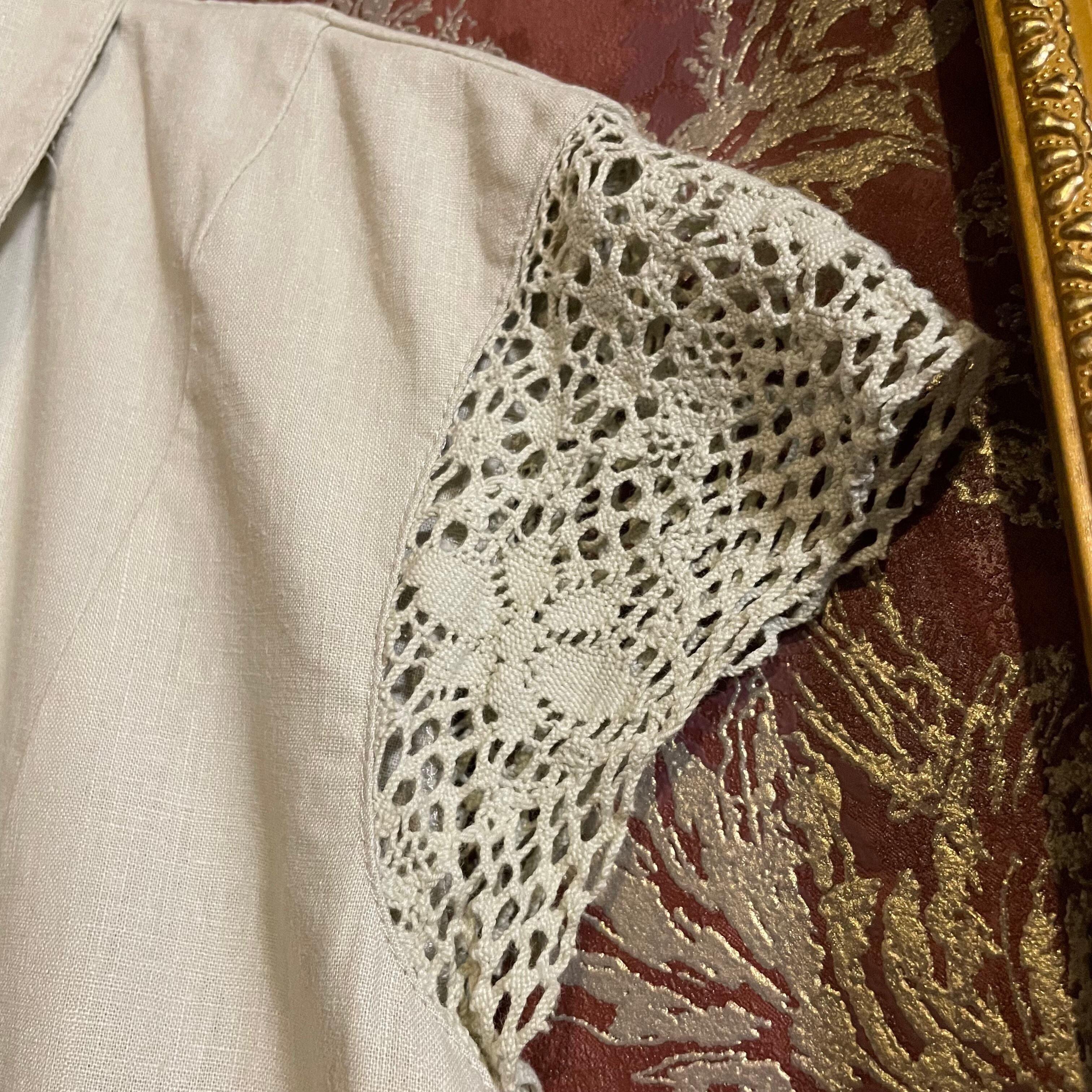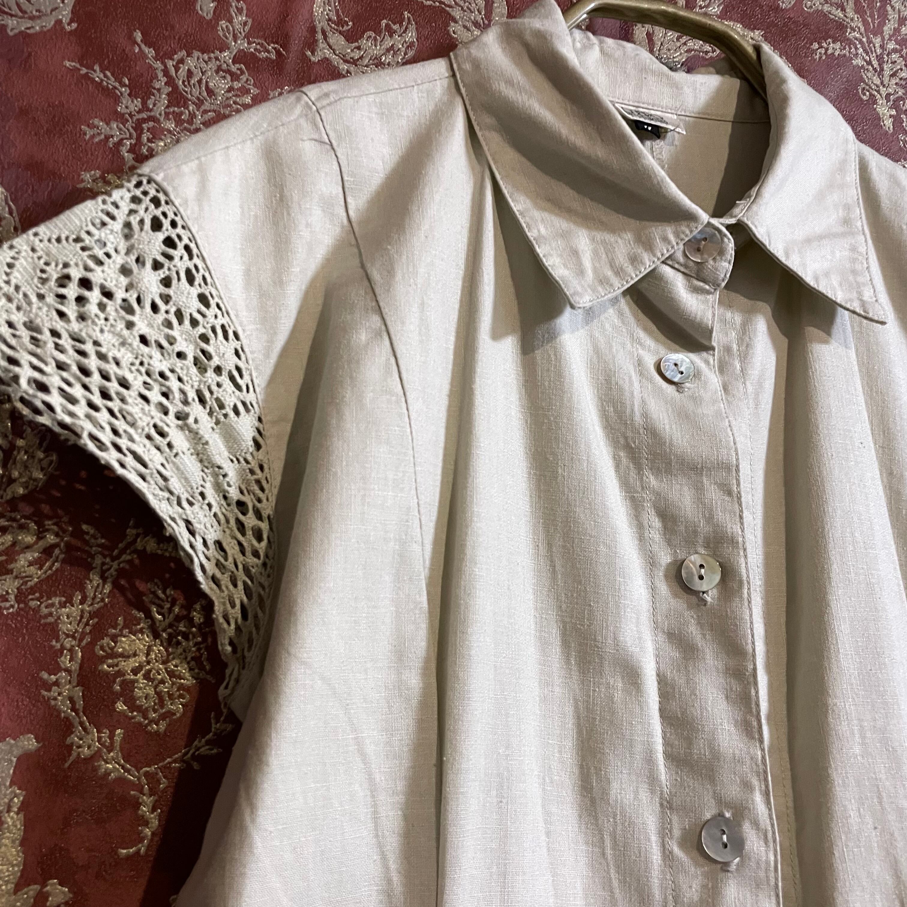 麻と綿の混紡素材が快適な着心地で、袖口と裾には上品なコットンレースをあしらい、細身のシルエットで女性らしいシルエットを演出します。