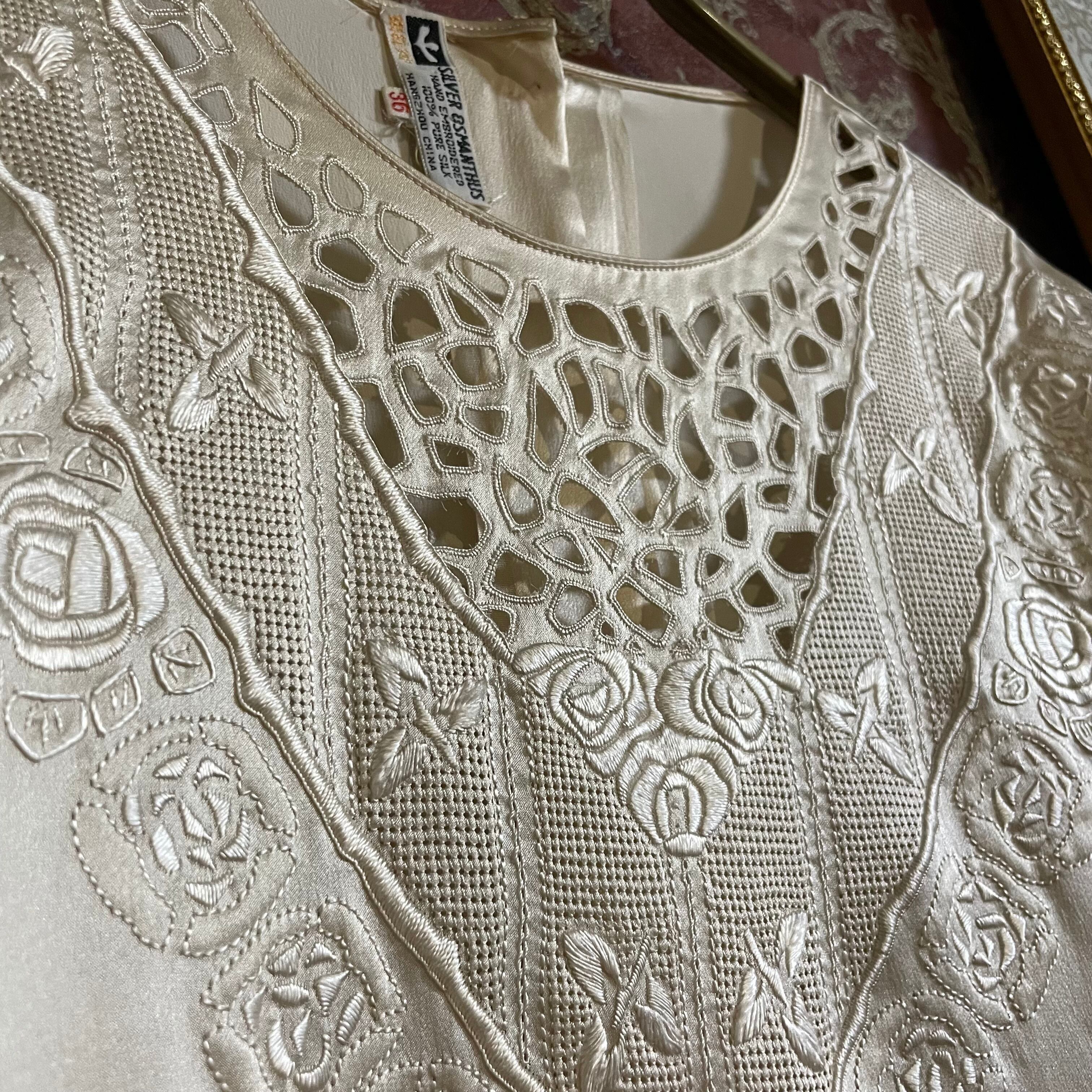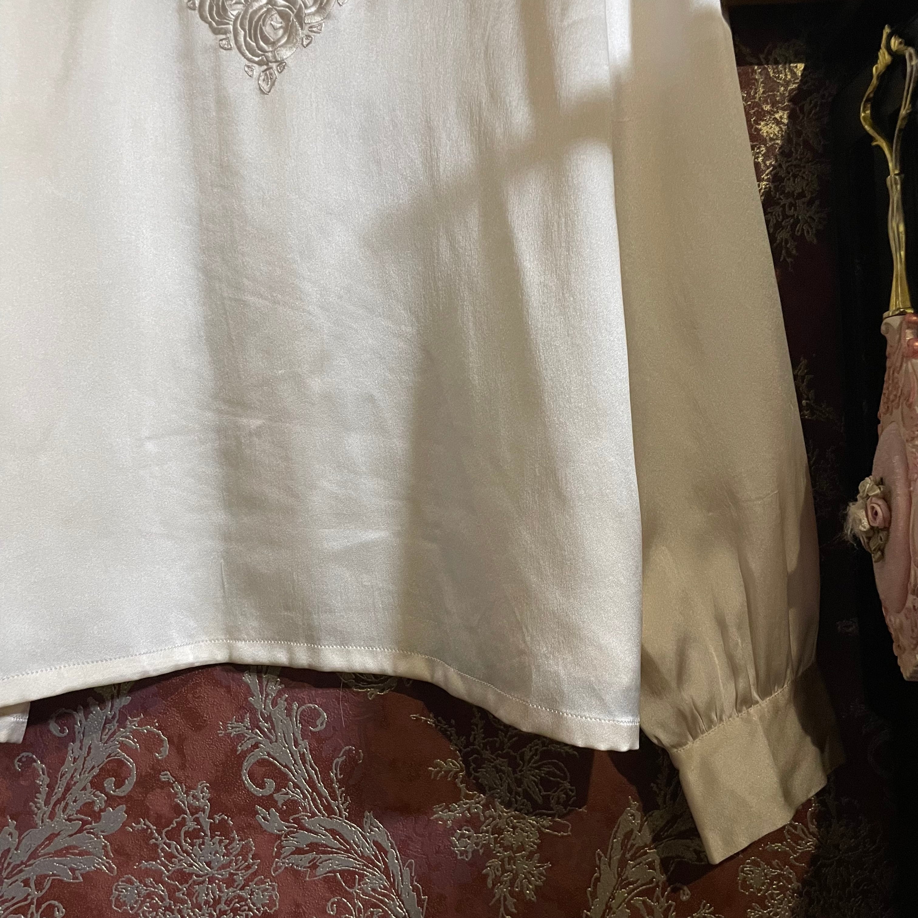乳白色の照りのあるシルクに、これでもかと言うほど丁寧で贅沢な刺繍が最高です。