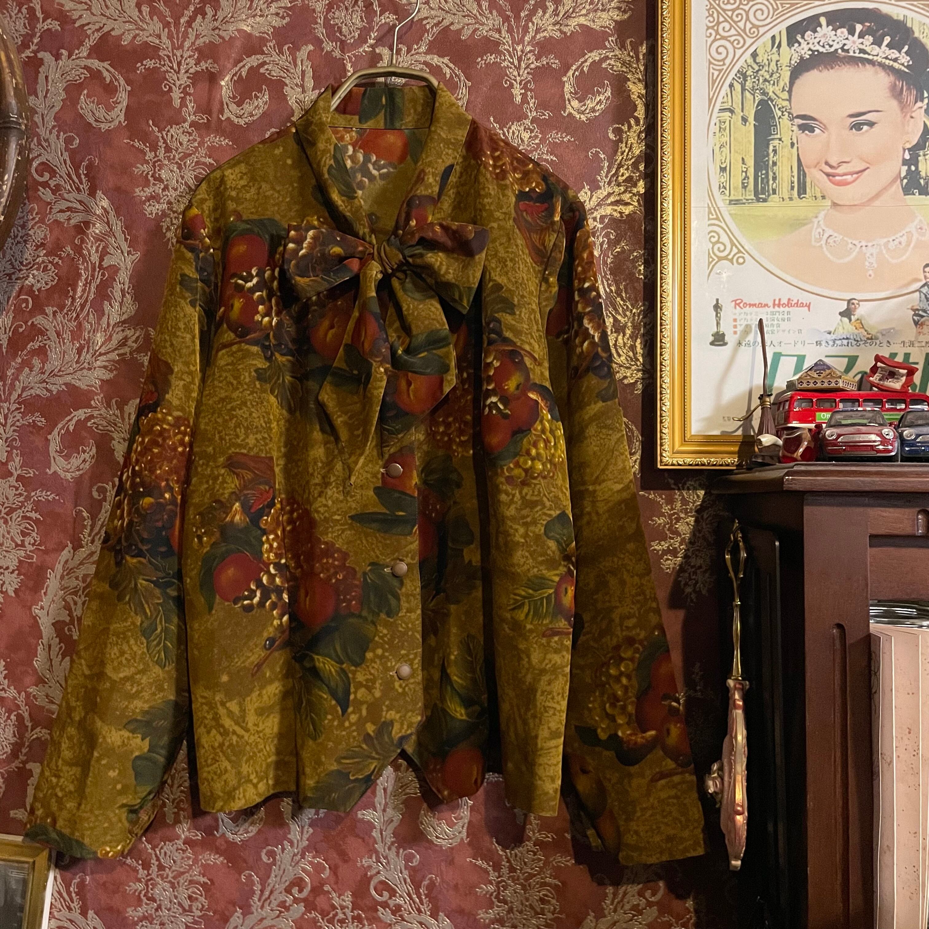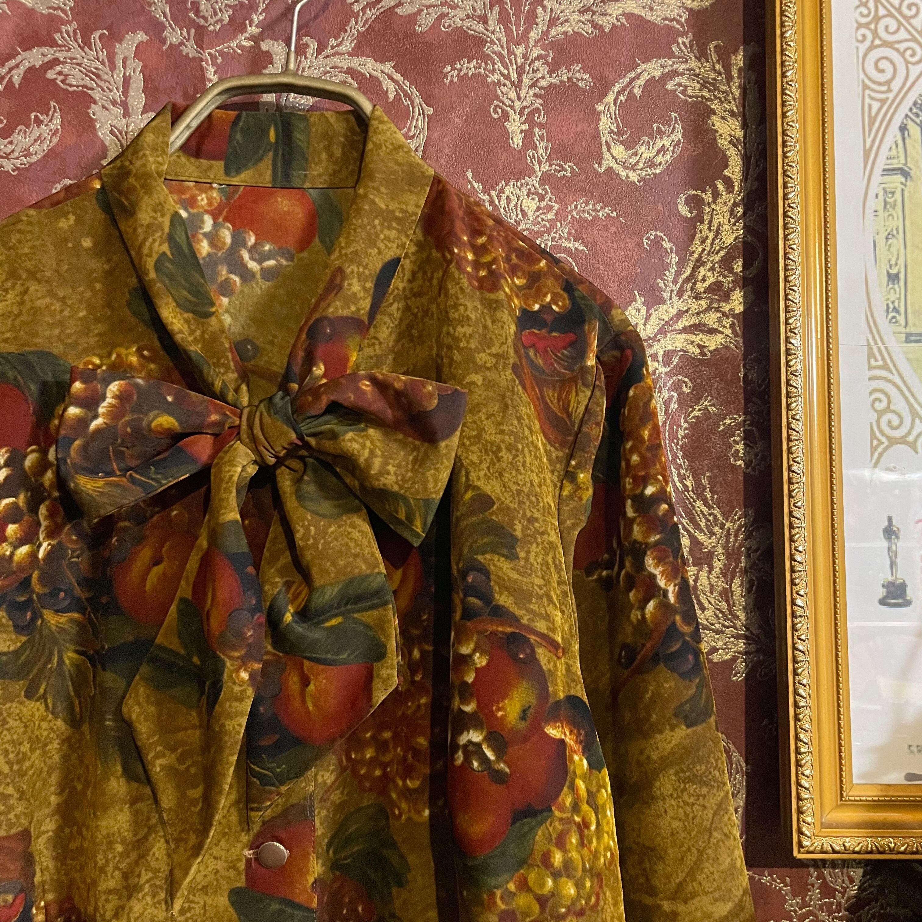 秋を感じさせるこっくりカラーが魅力的なフルーツ柄のブラウスです。