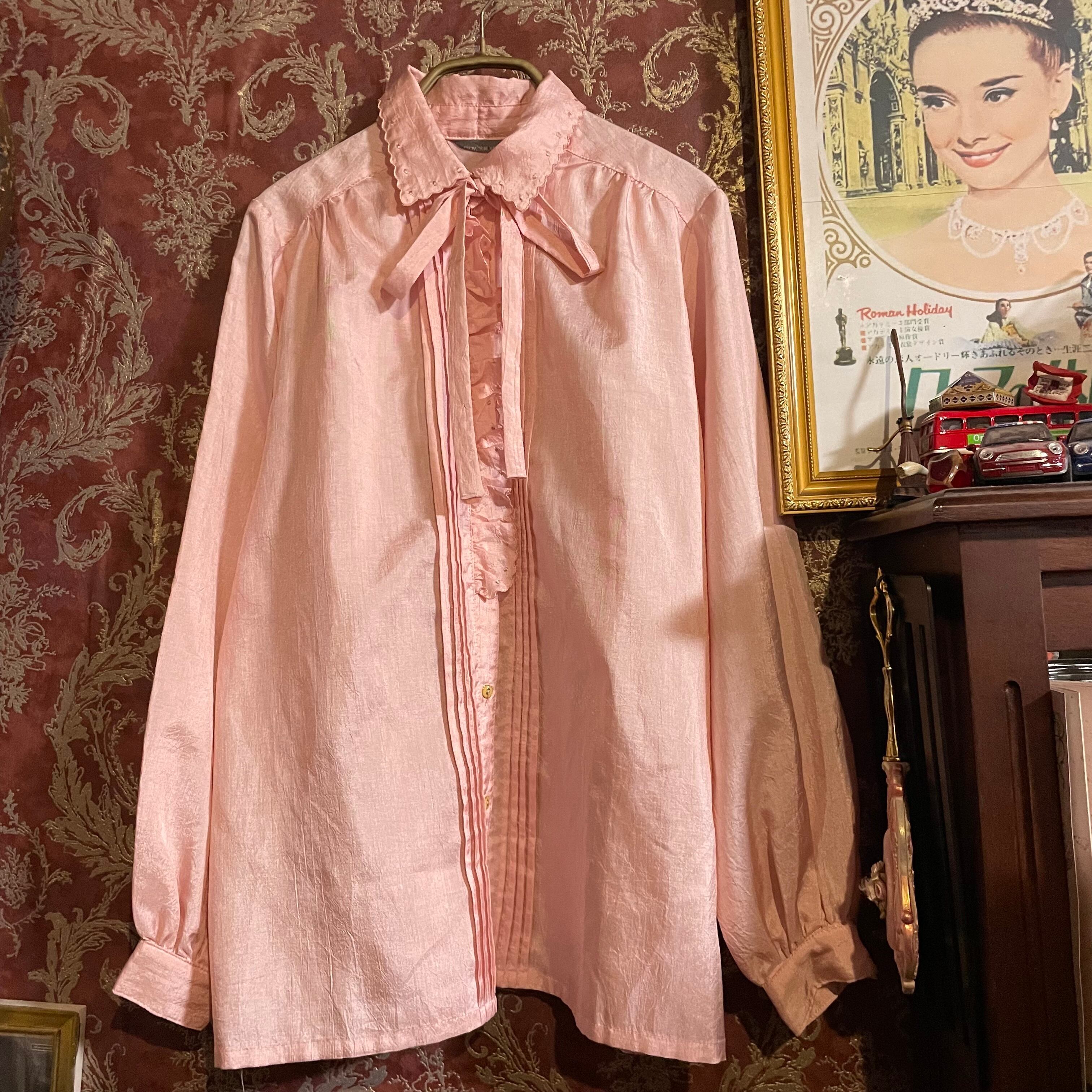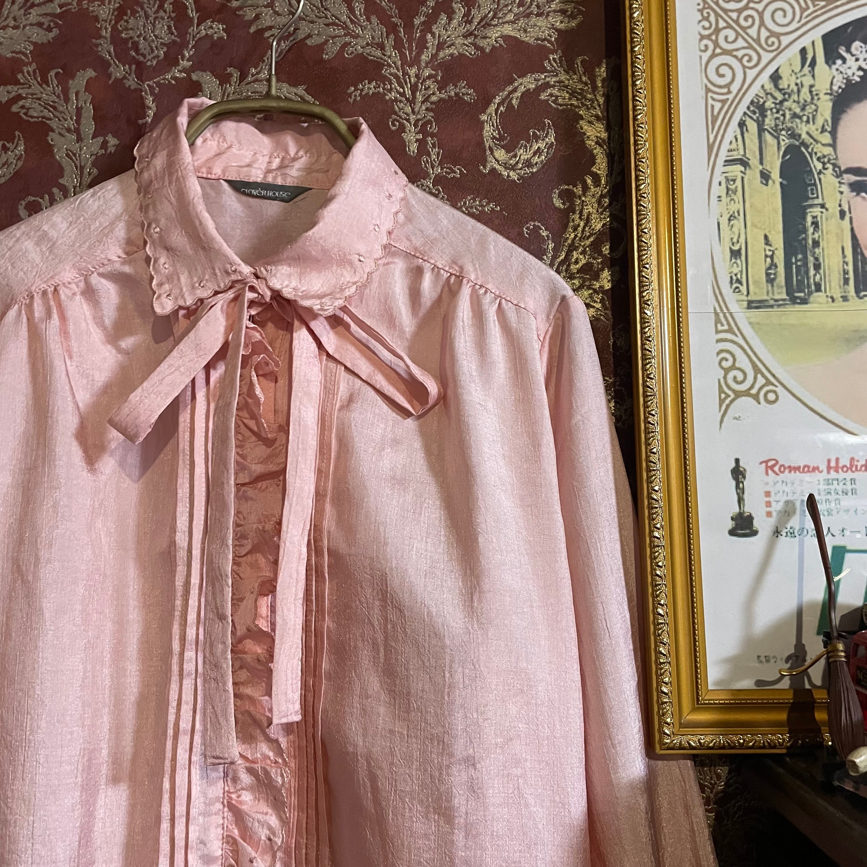 透明感のあるパールのようなピンク色が魅力的なスカラップ襟のブラウスです。