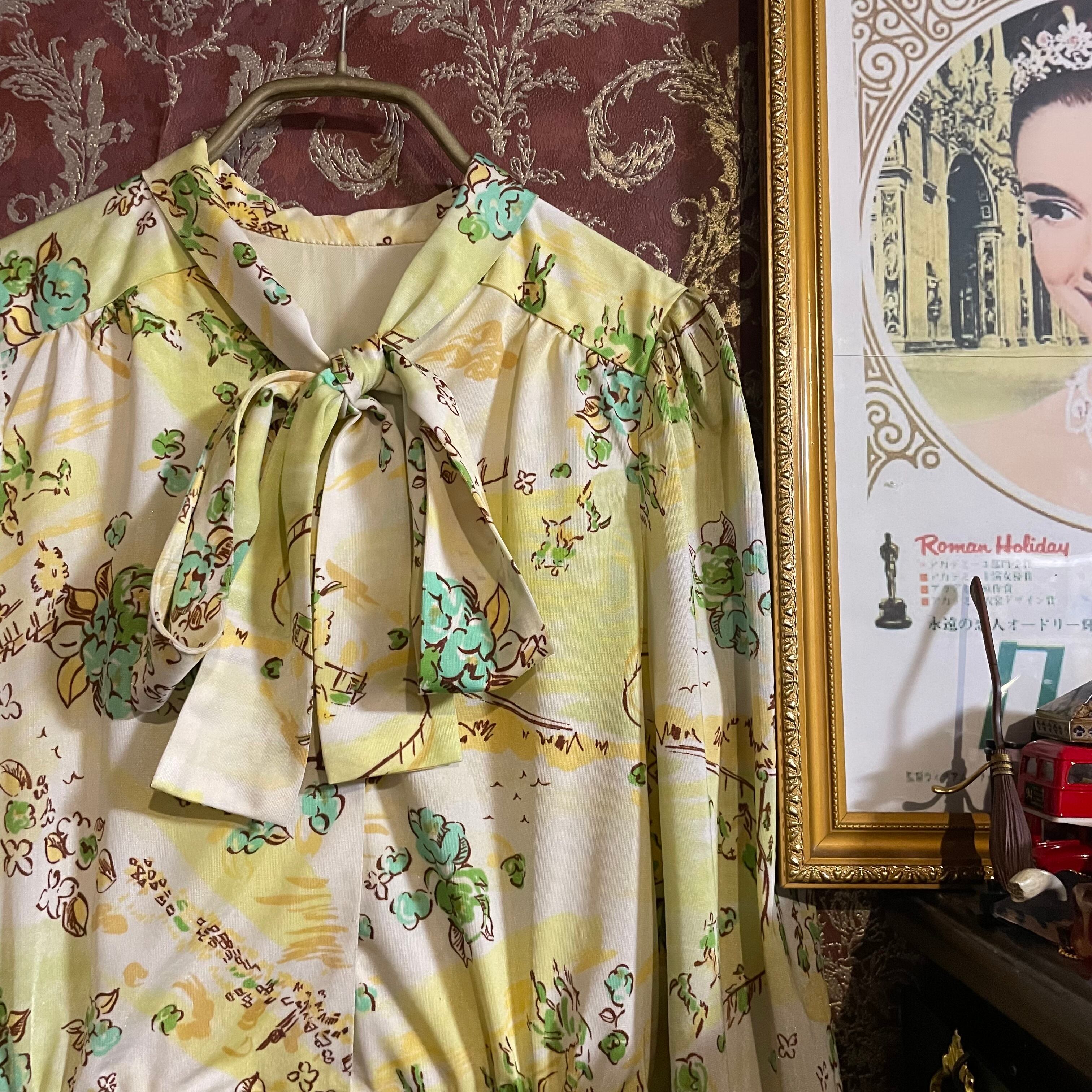 淡い緑のトーンが女性らしさを引き立てるボウタイワンピースです。