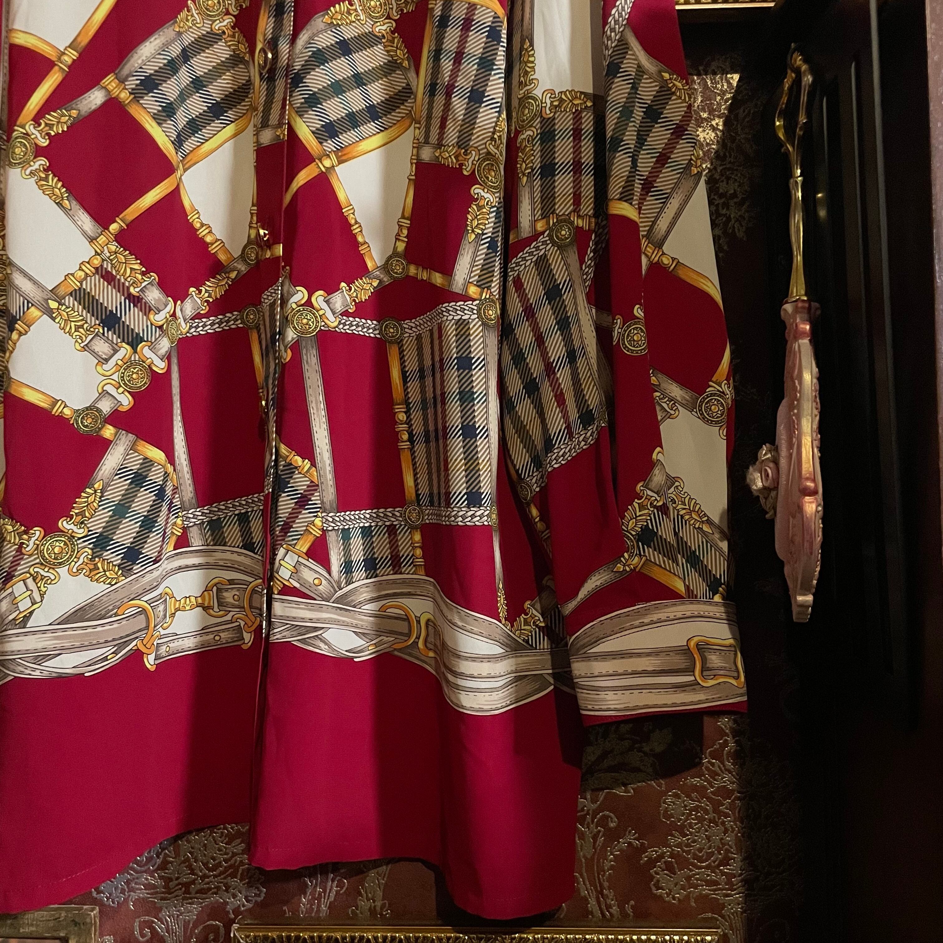 落ち着きのある赤とダックスらしいチェック、ベルトで構成されたデザインで、大きめのシルエットです。