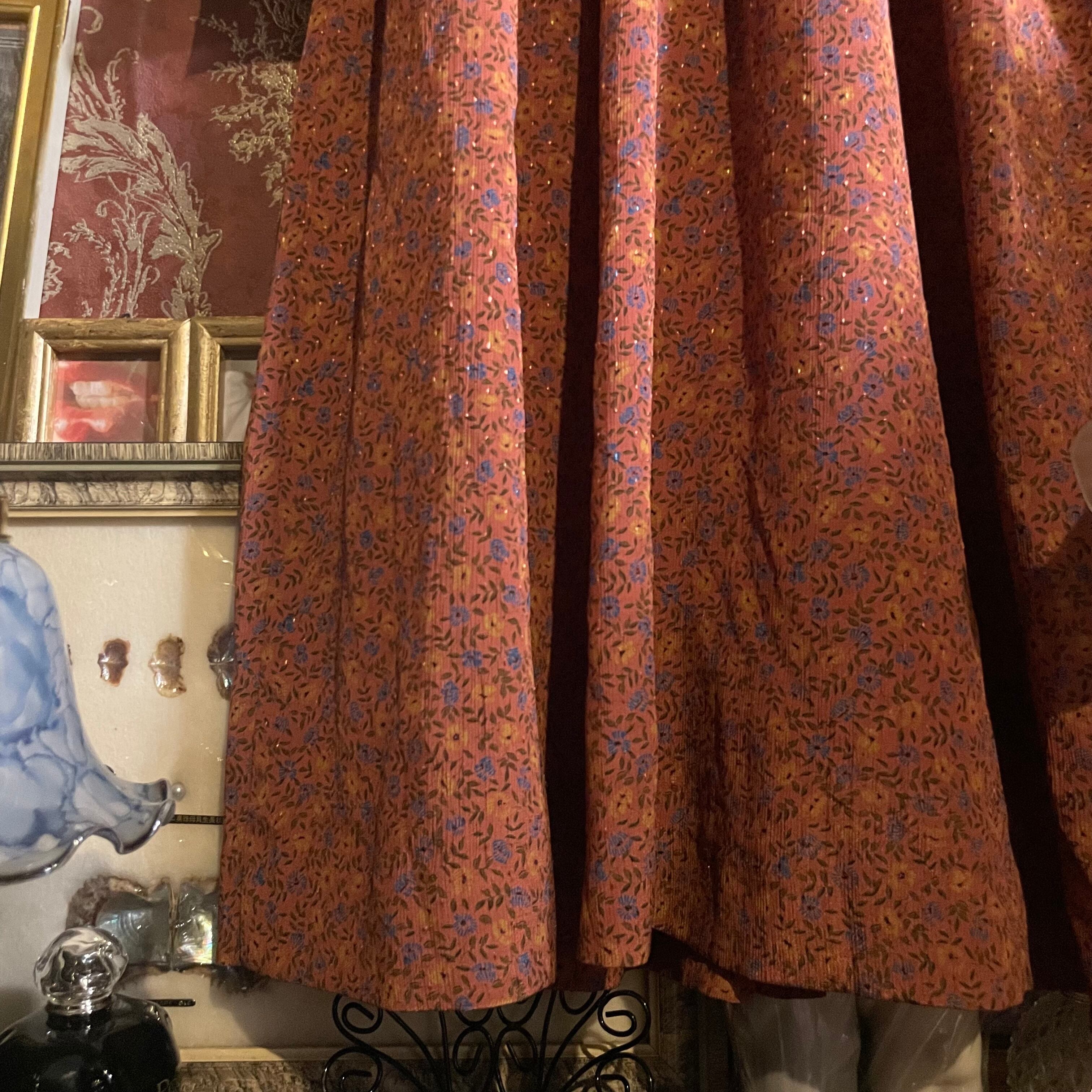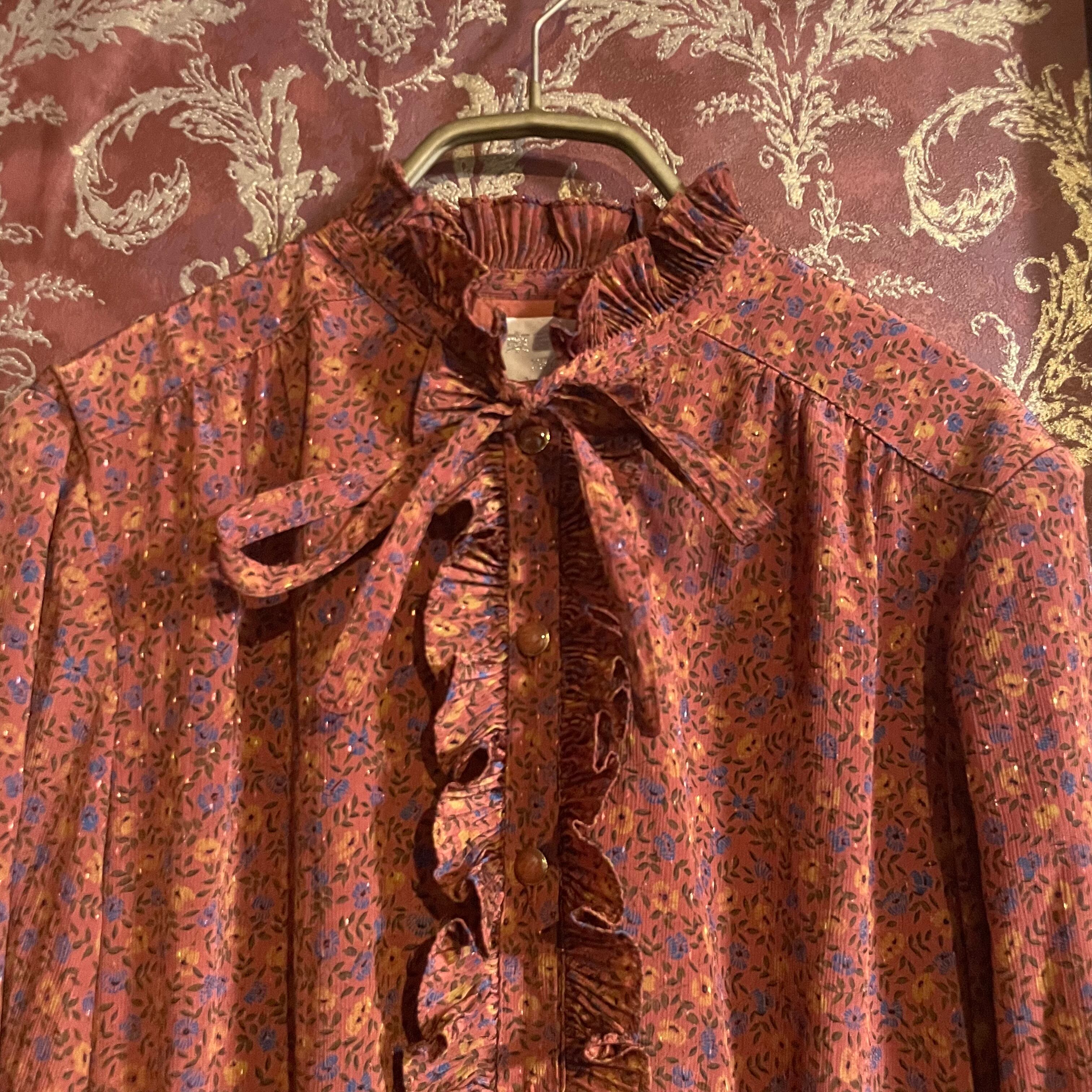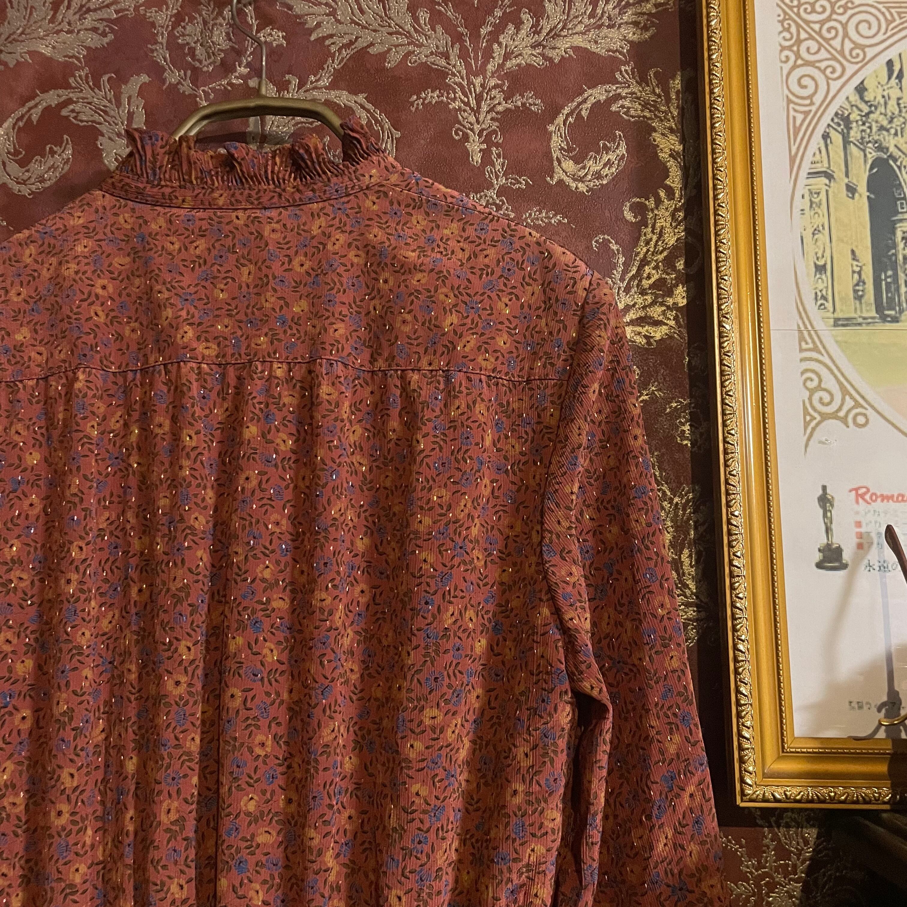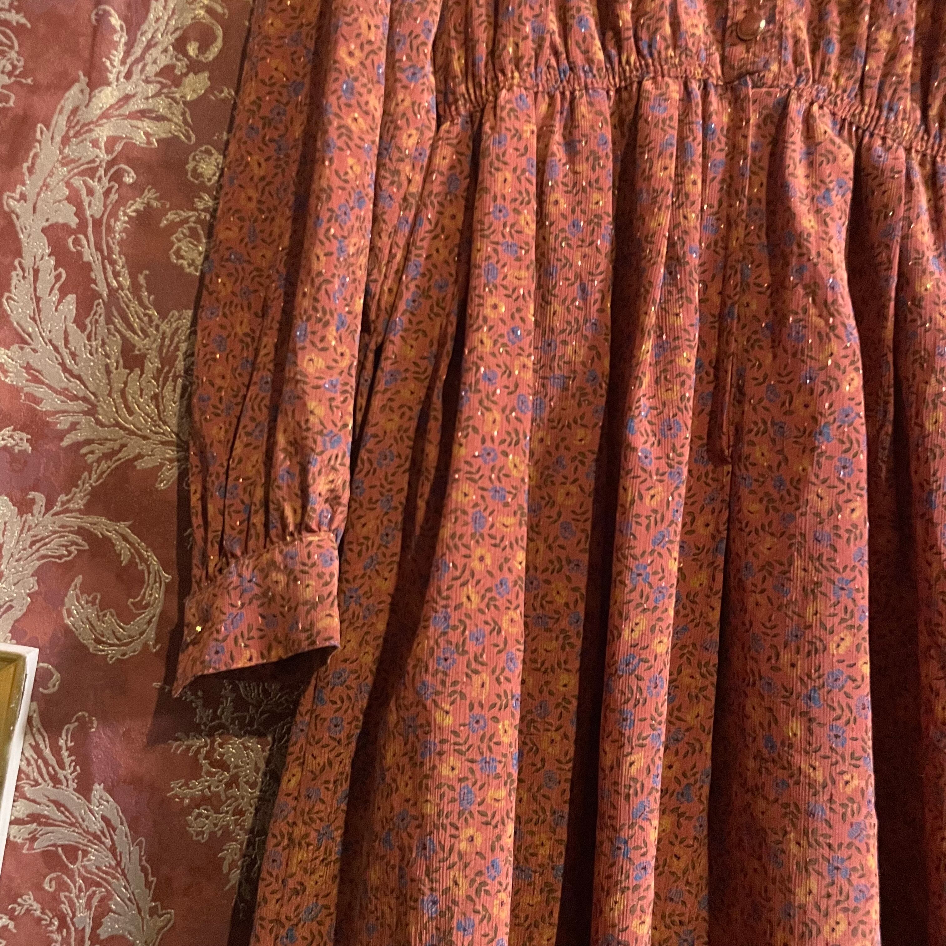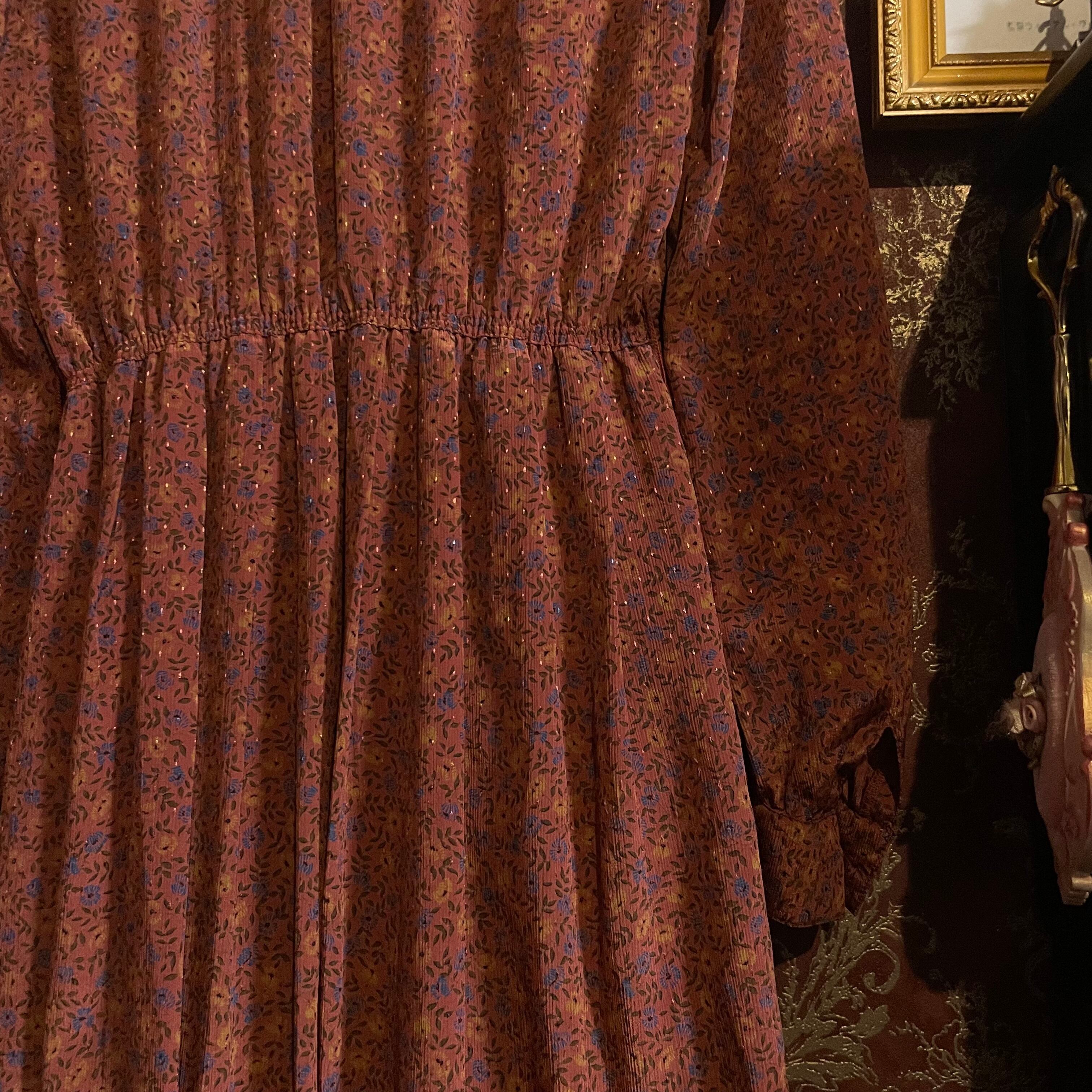 くすんだ赤を基調とし、花柄とドット柄が織り込まれたジャガード生地が特徴のレトロなワンピースです。