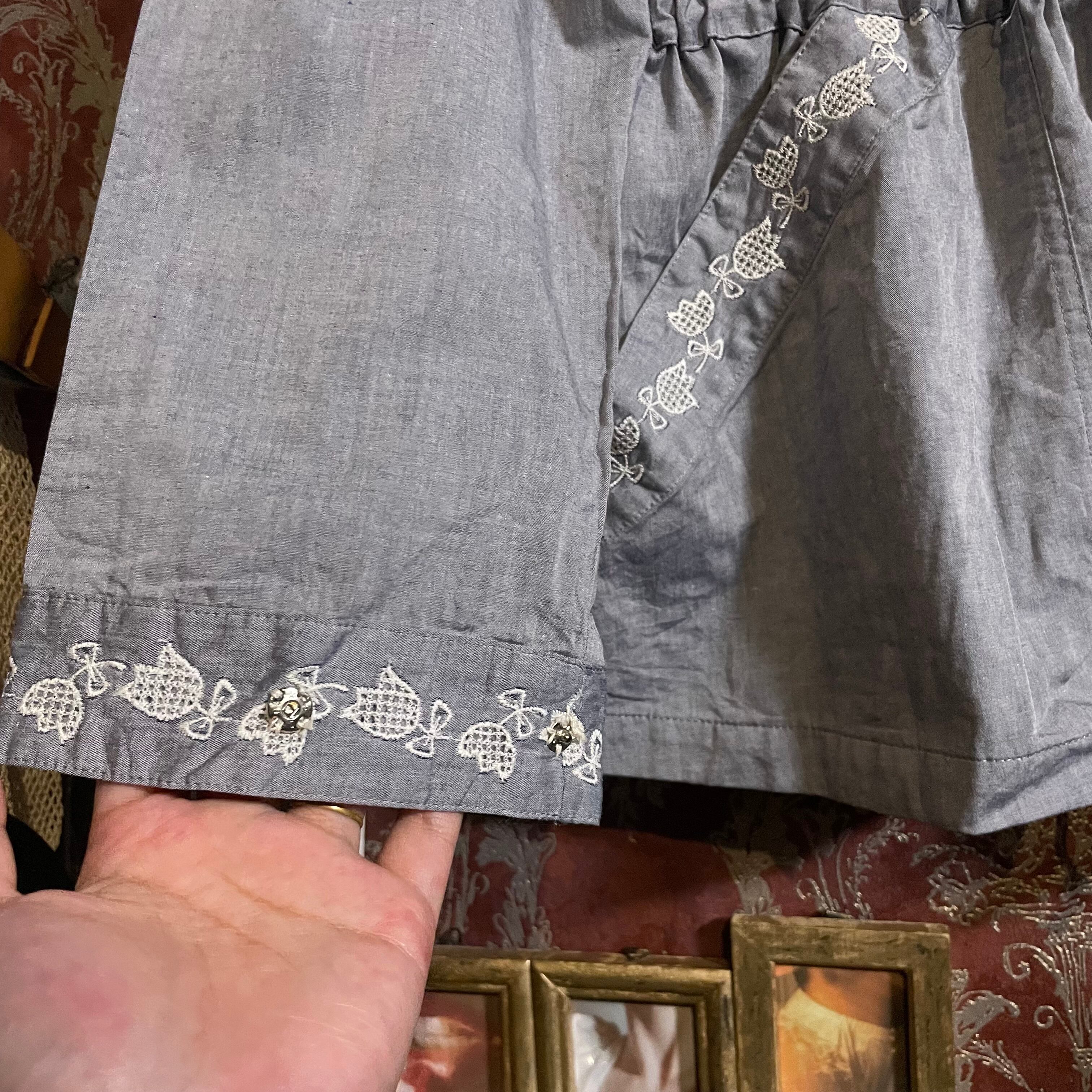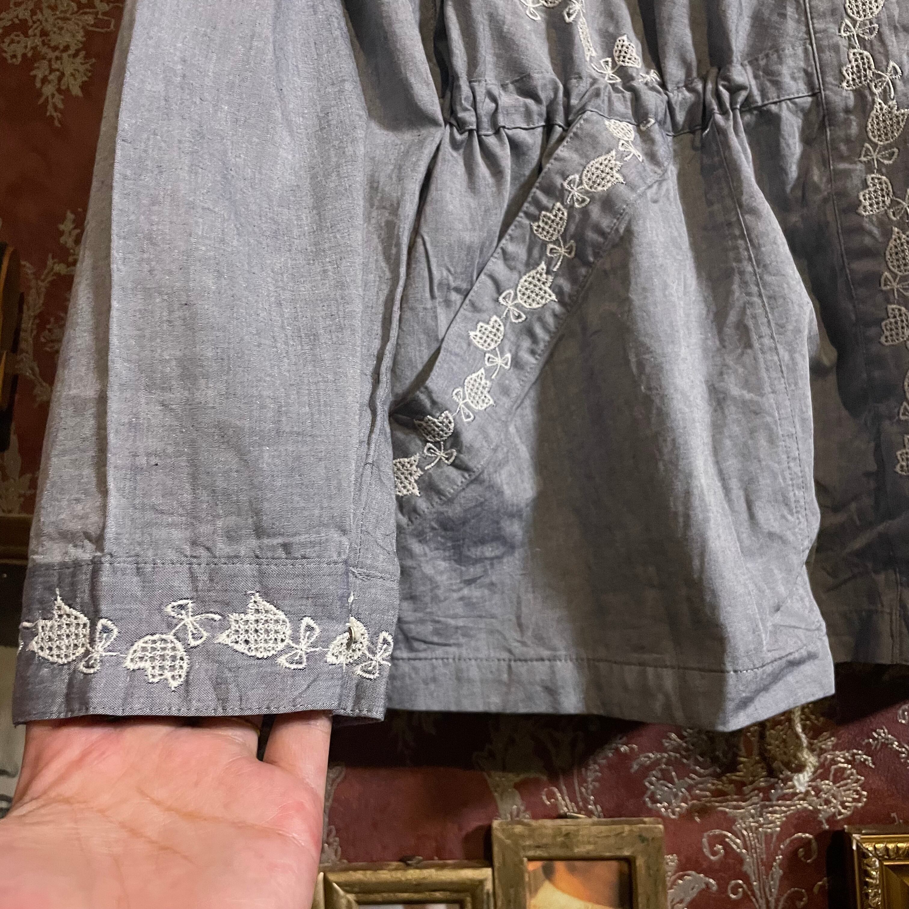 白の花刺繍が可愛らしいシャンブレーブラウスです。