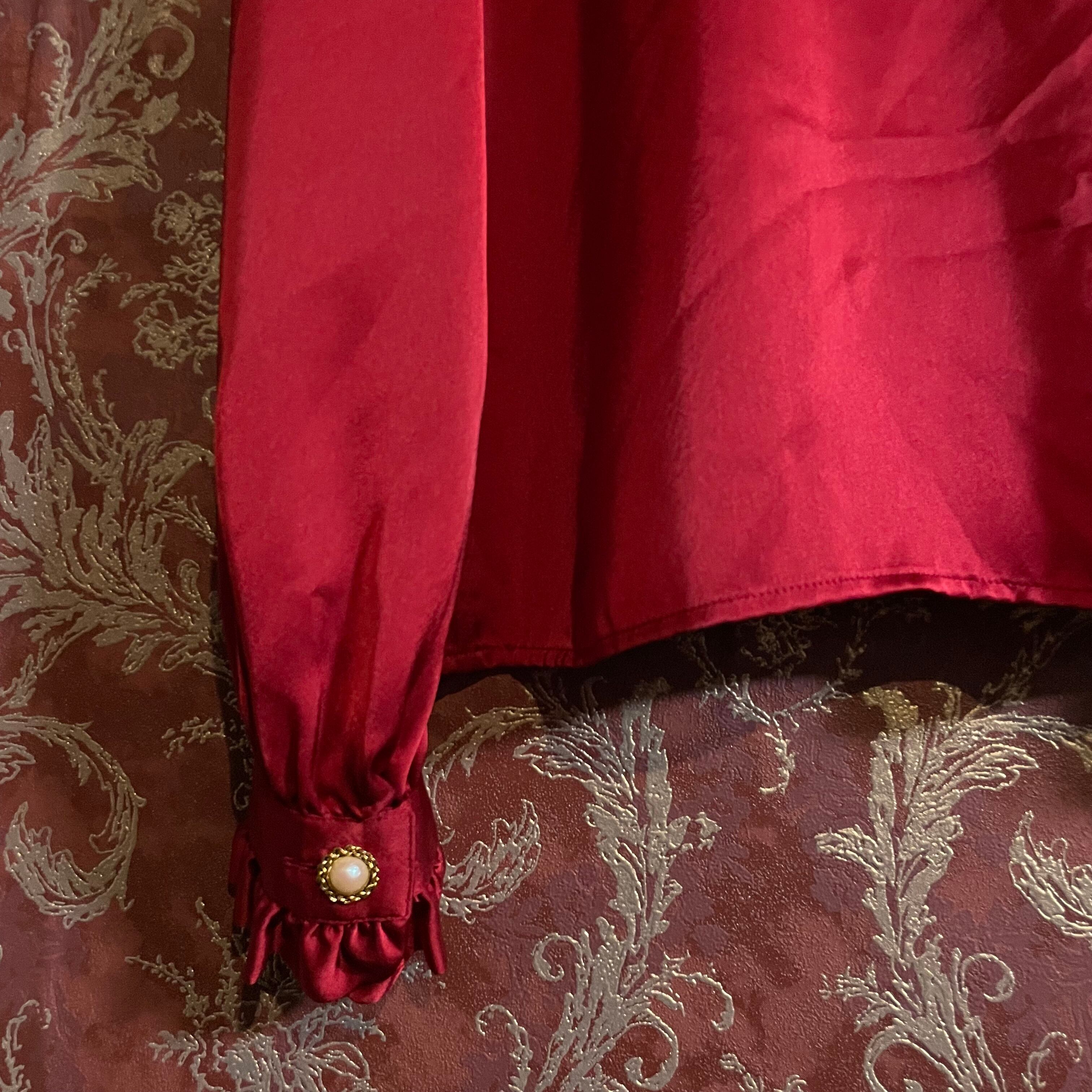 襟やフロント、カフスには共布のフリルが沢山つけられていて豪華な印象です。