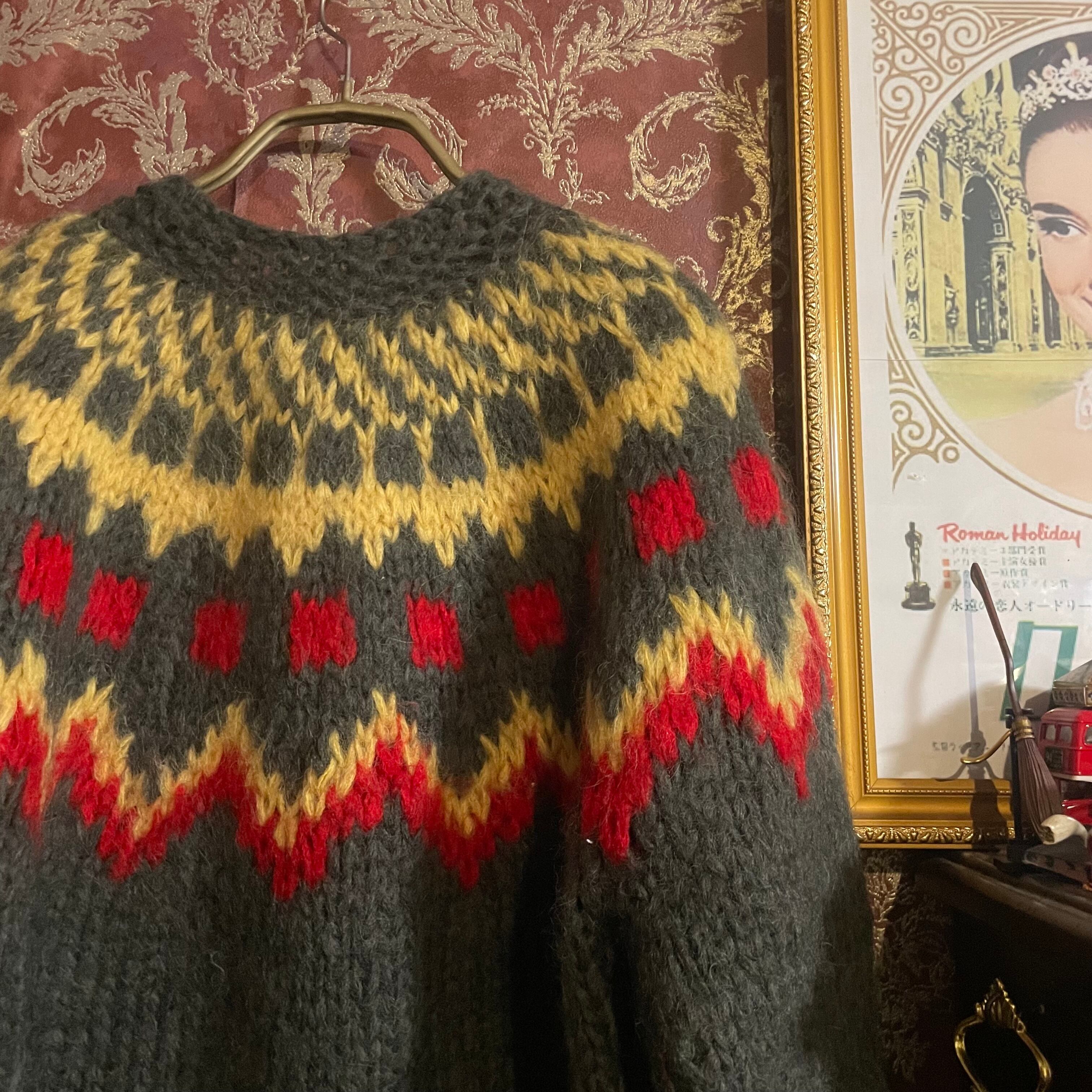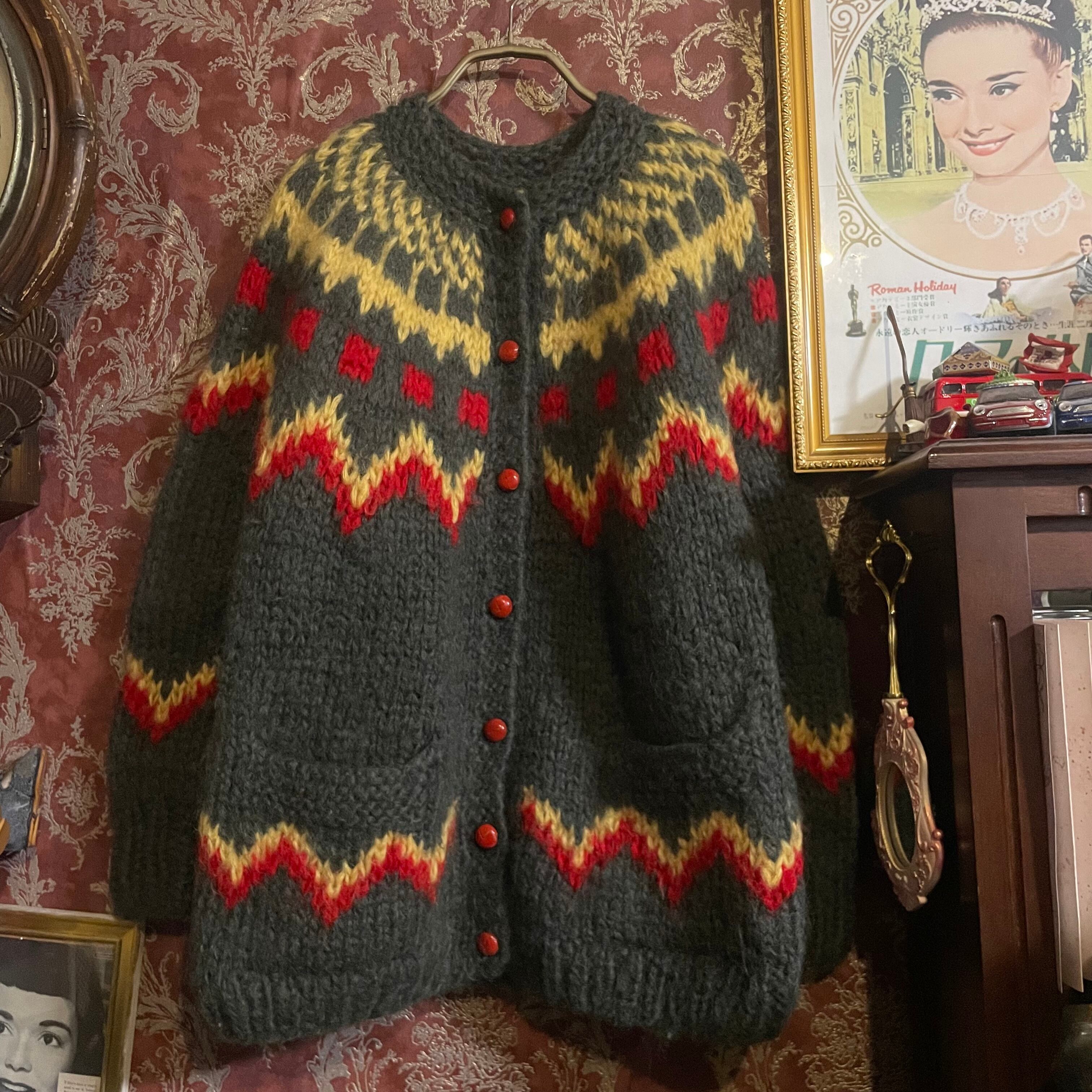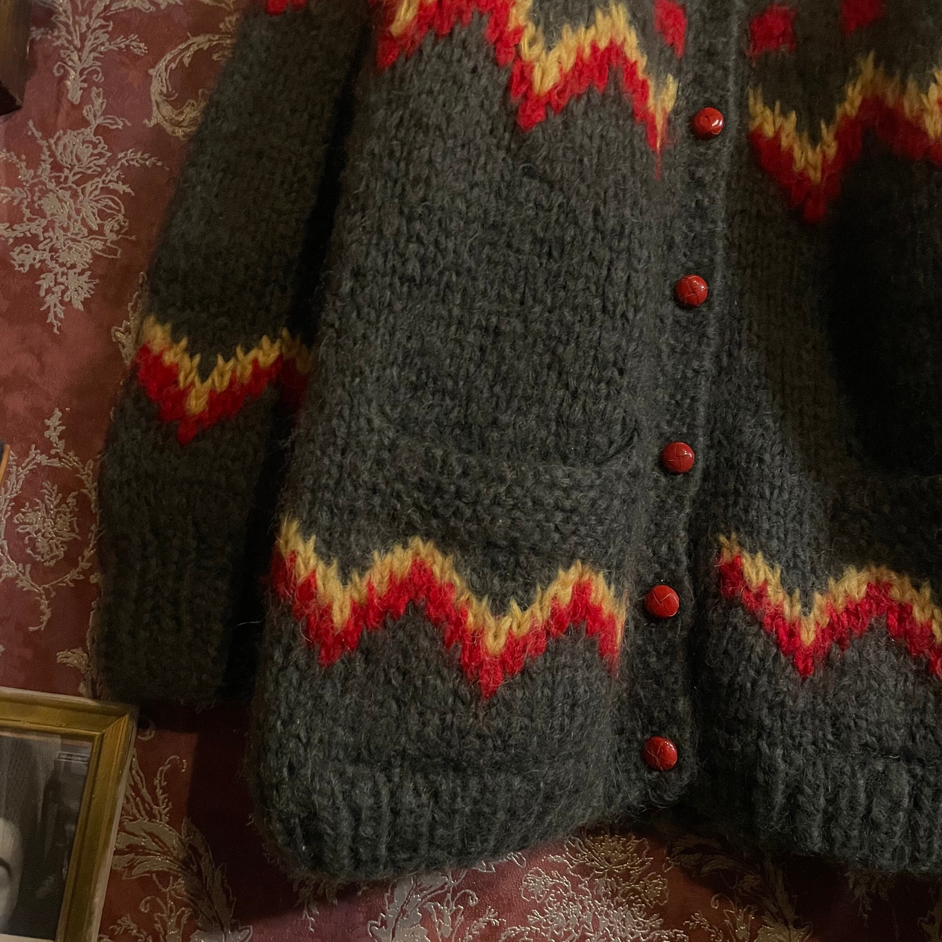 カーキ、赤、黄の色合いが魅力的なニットカーディガンです。