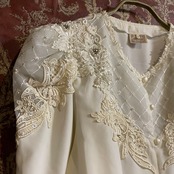 高貴な印象白ブラウスで、フロントや肩周りのレースとパール調ビーズ、ビジューの装飾が華やかな印象の一着です。