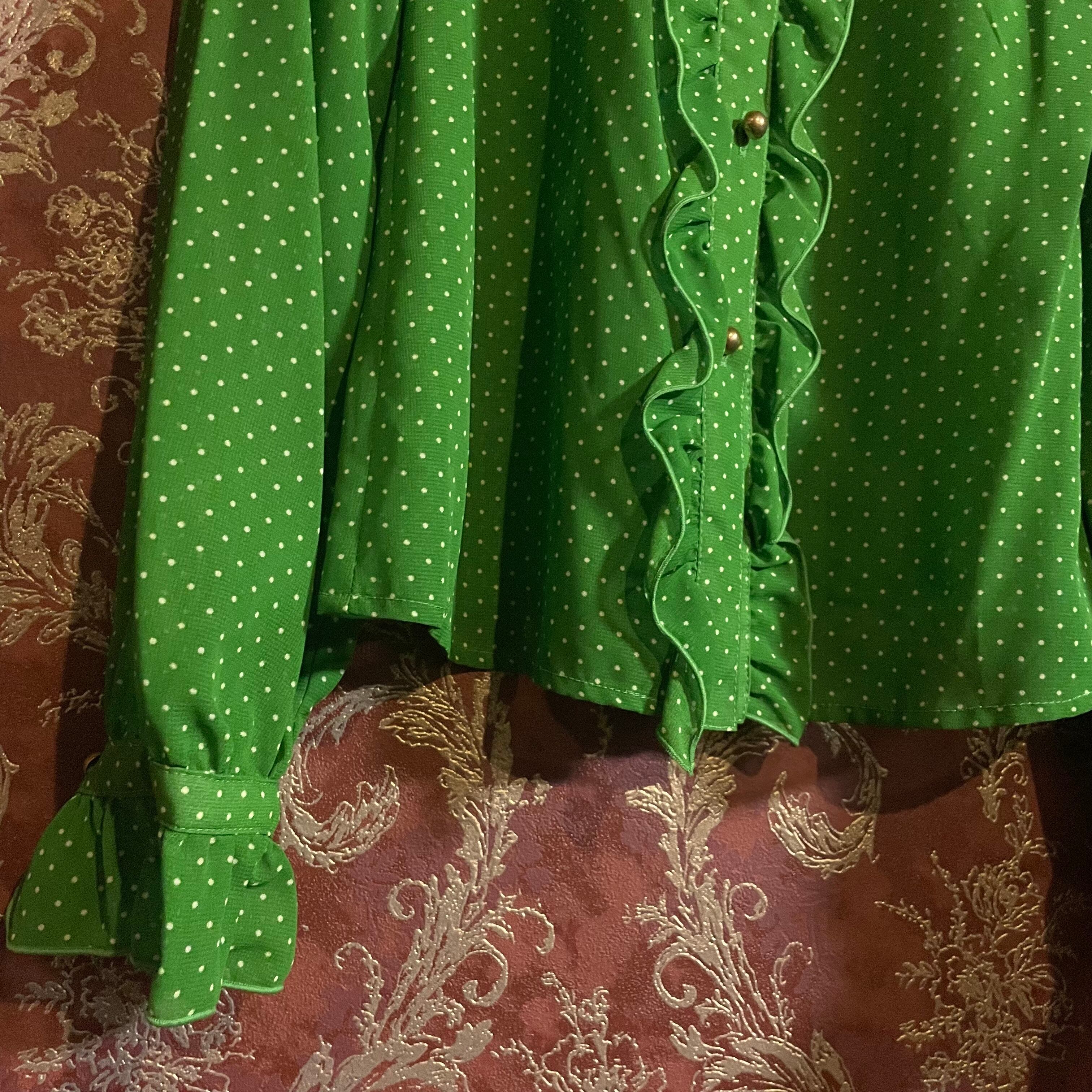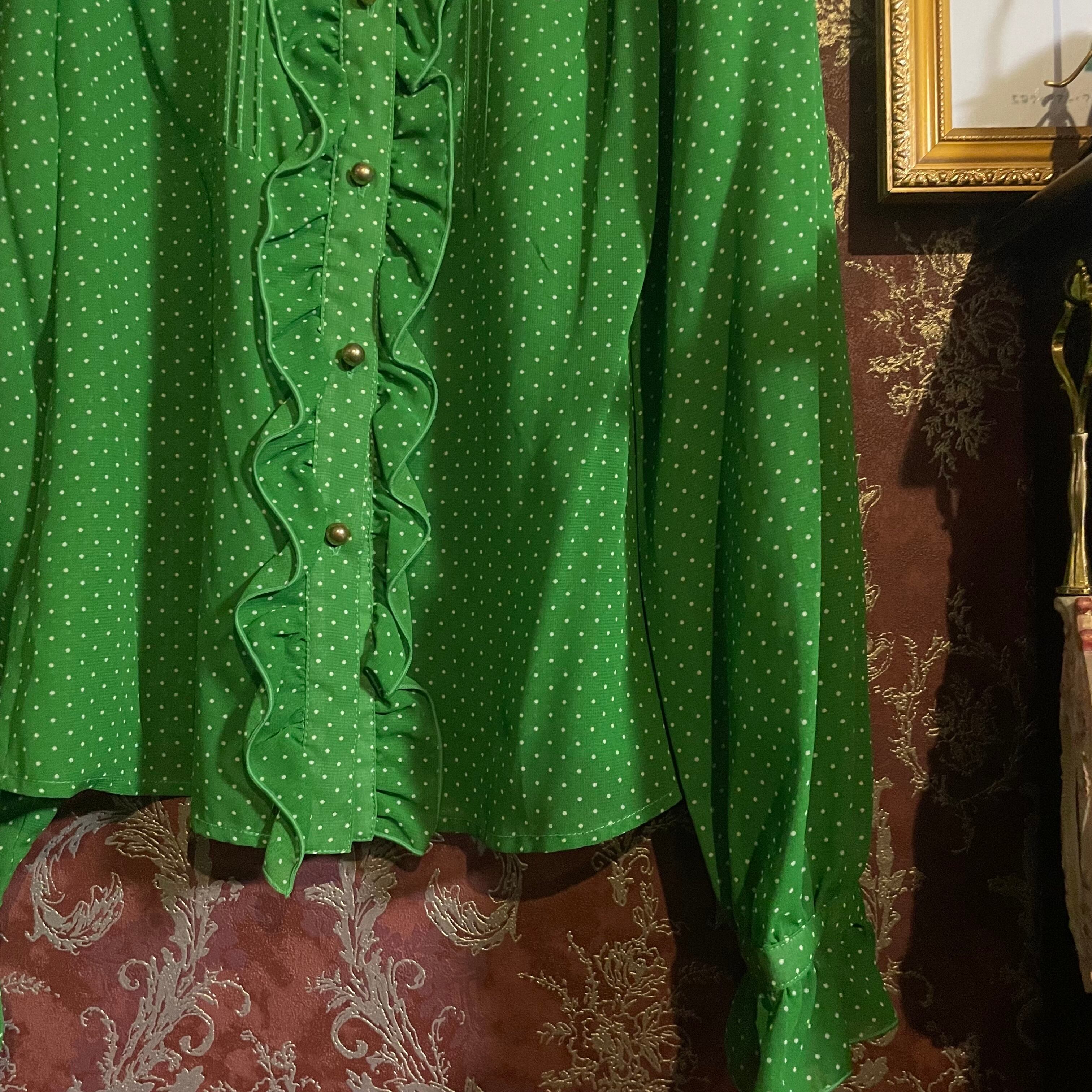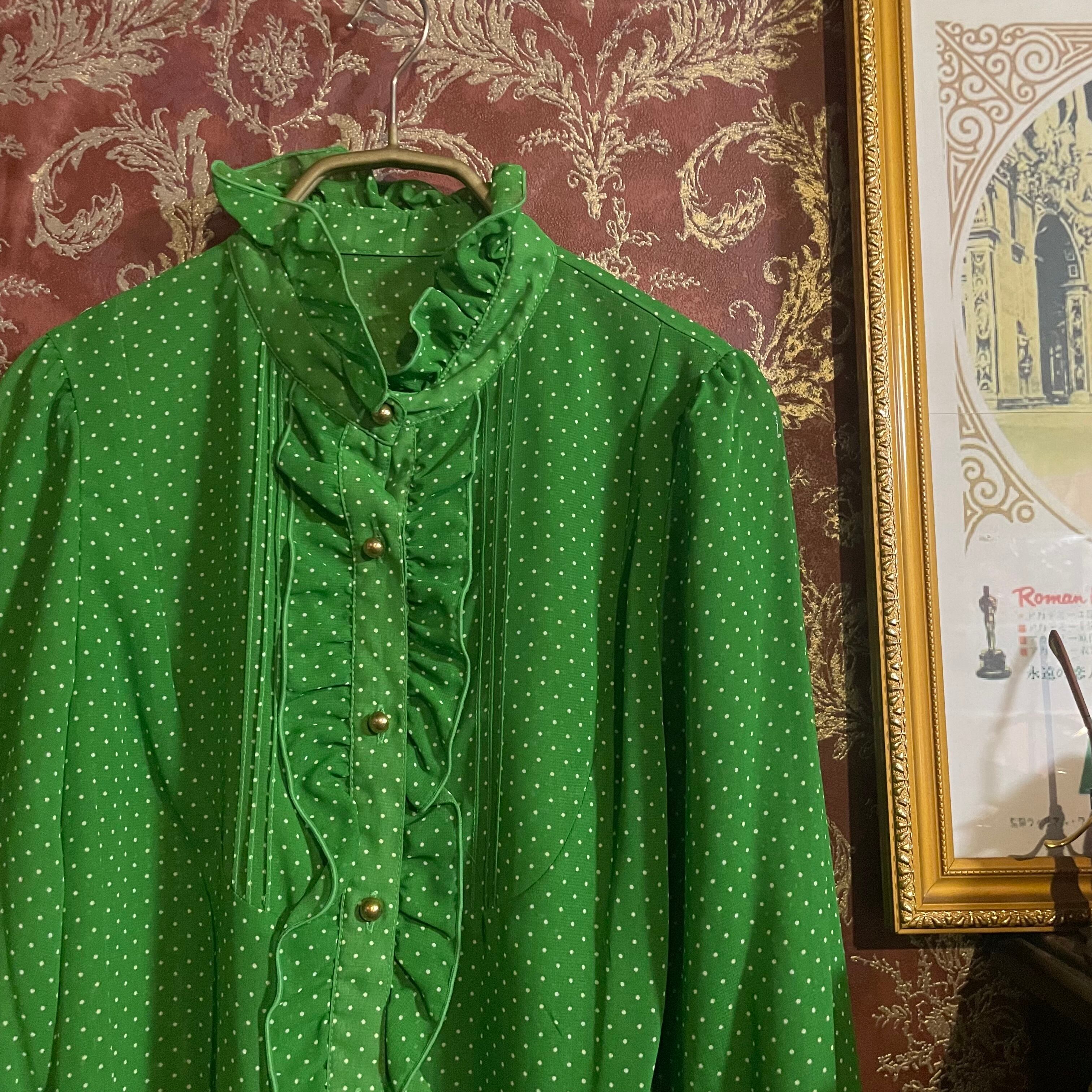 緑をベースにした可愛らしい白のドット柄が印象的な、ゴールドボタン付きのブラウスです。