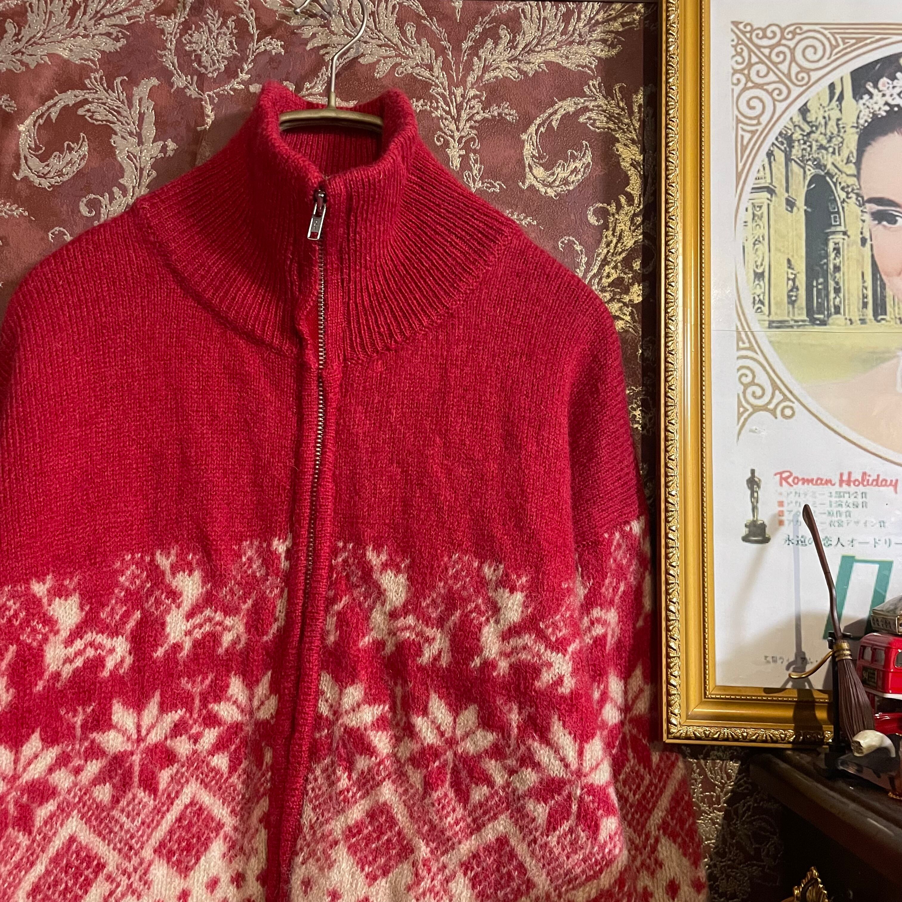 赤と白のノルディック柄カーディガンです。