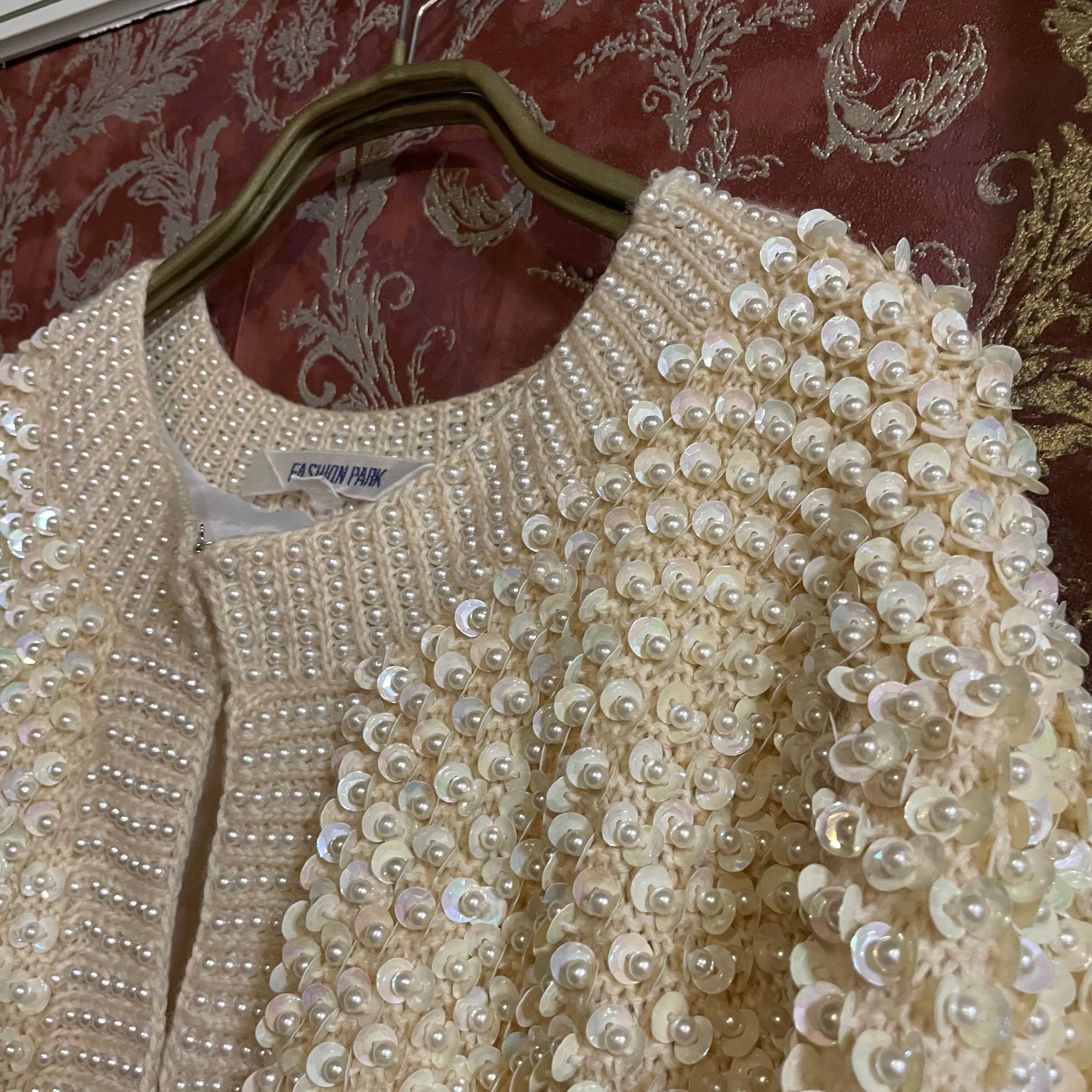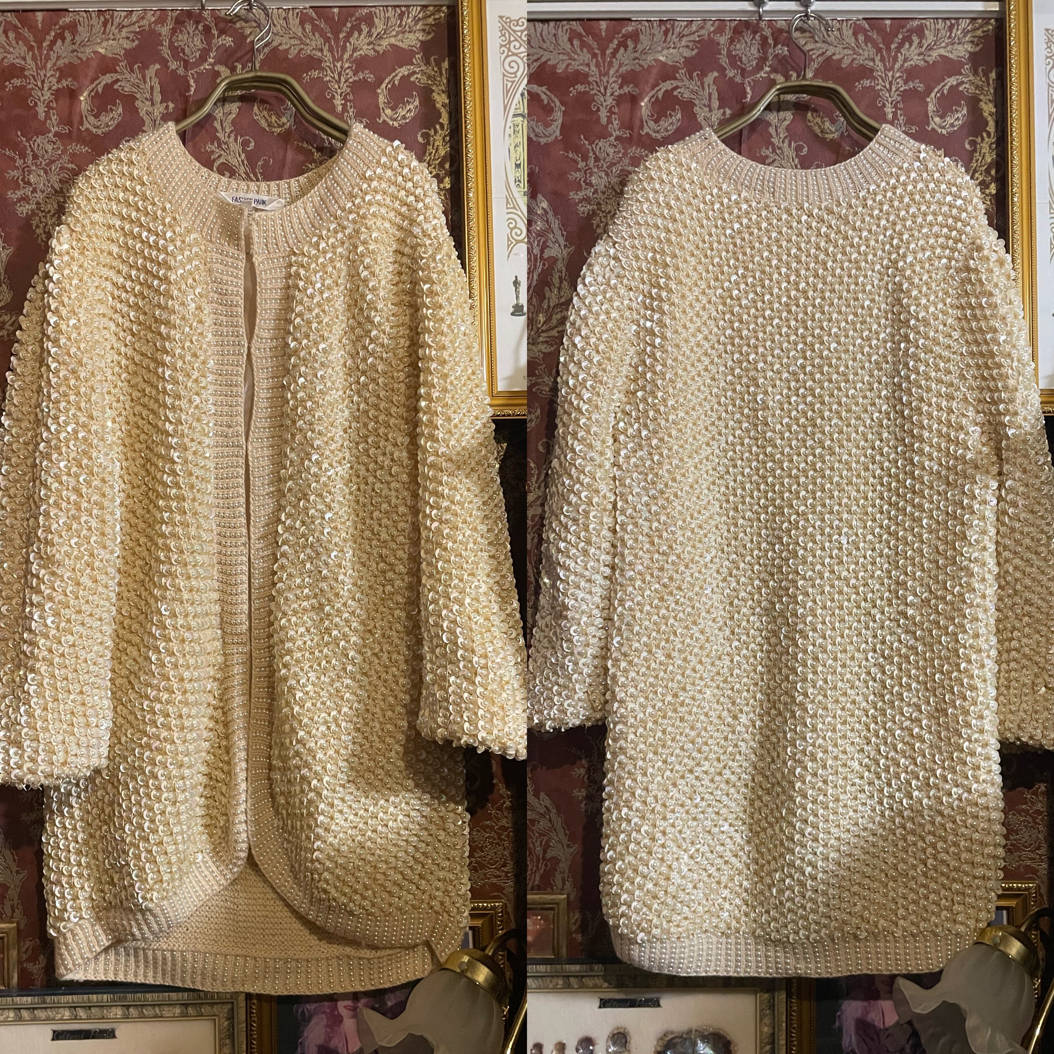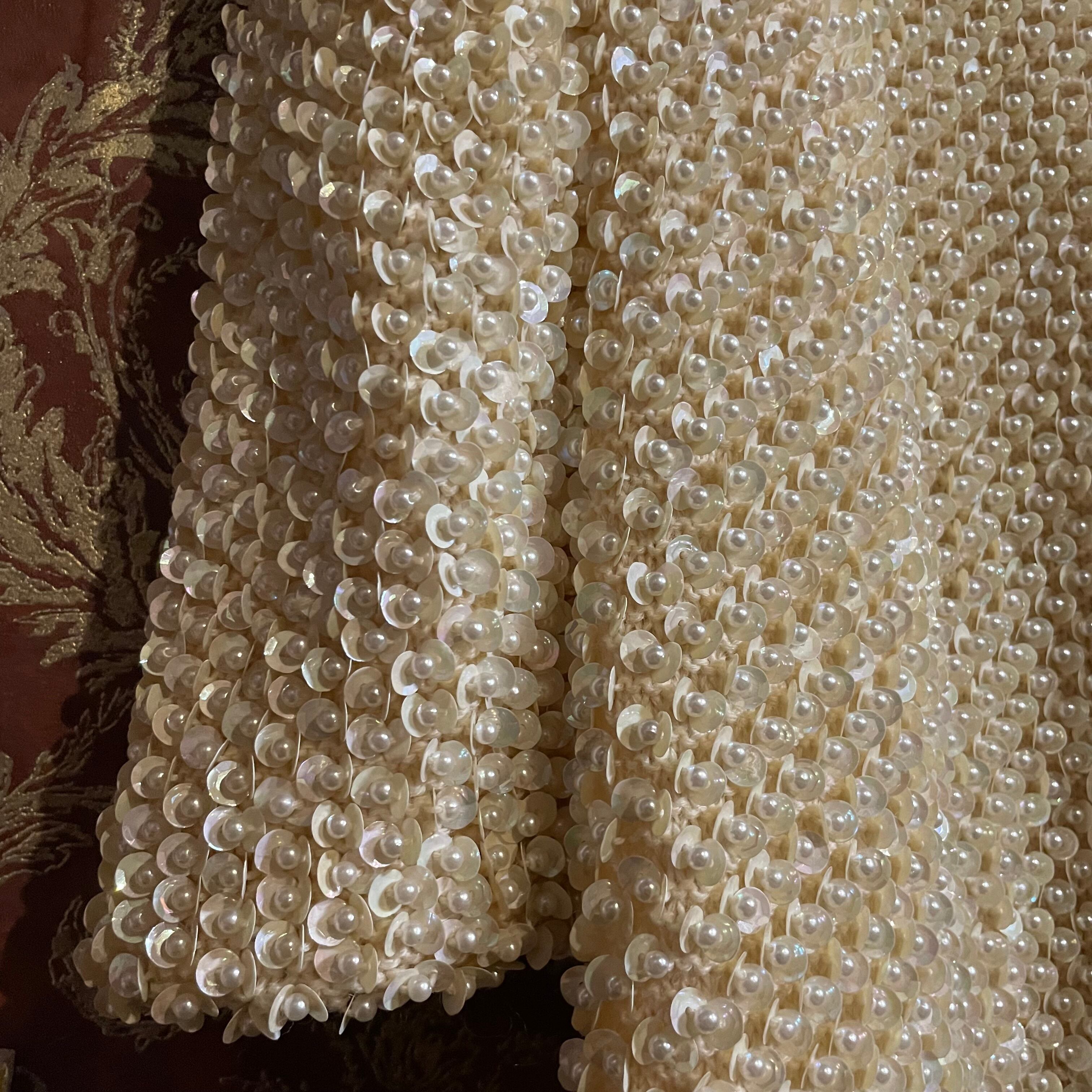 手編みでつけられたパールビーズとオーロラのスパンコールで装飾されており、まるで貝殻のような輝きと存在感を放ちます。