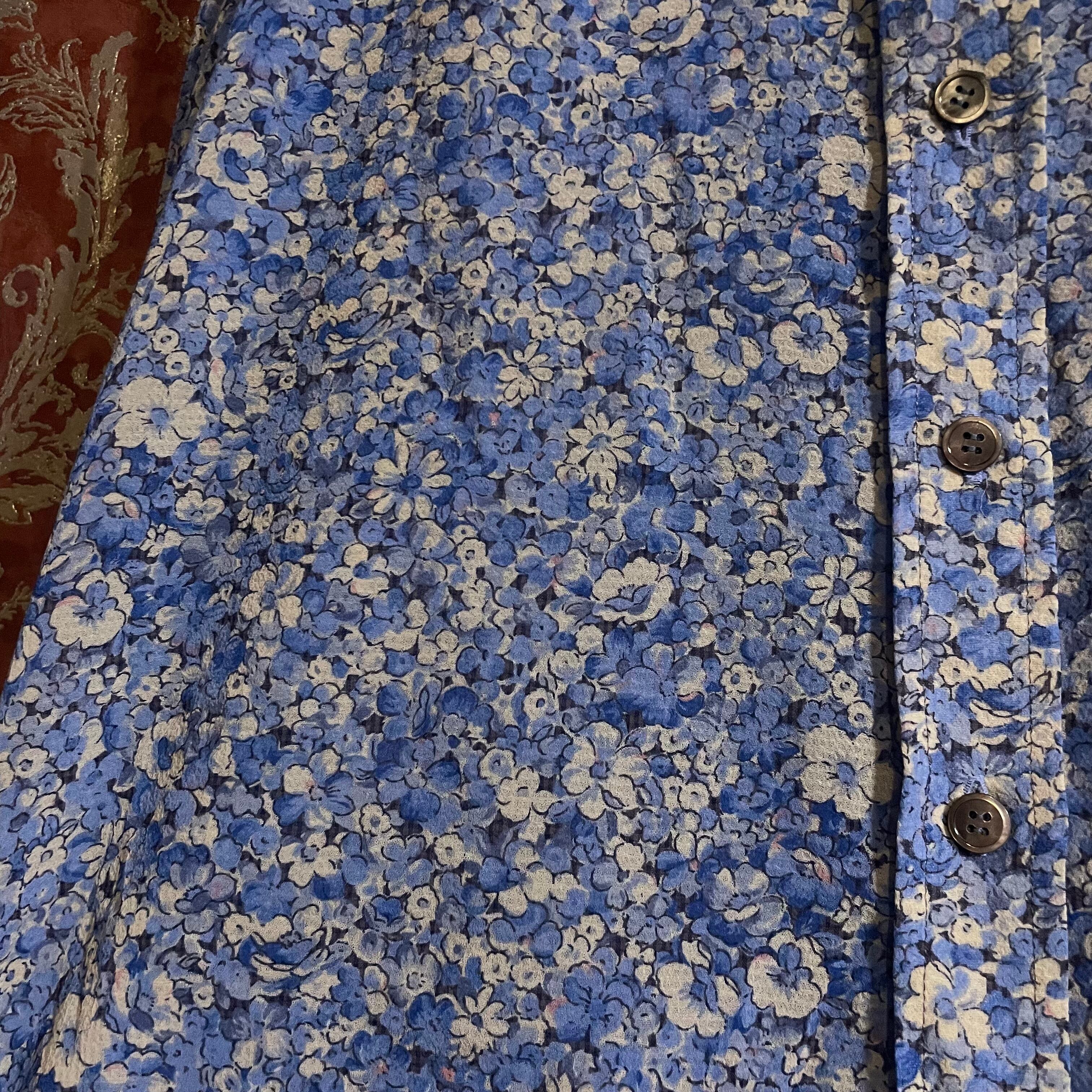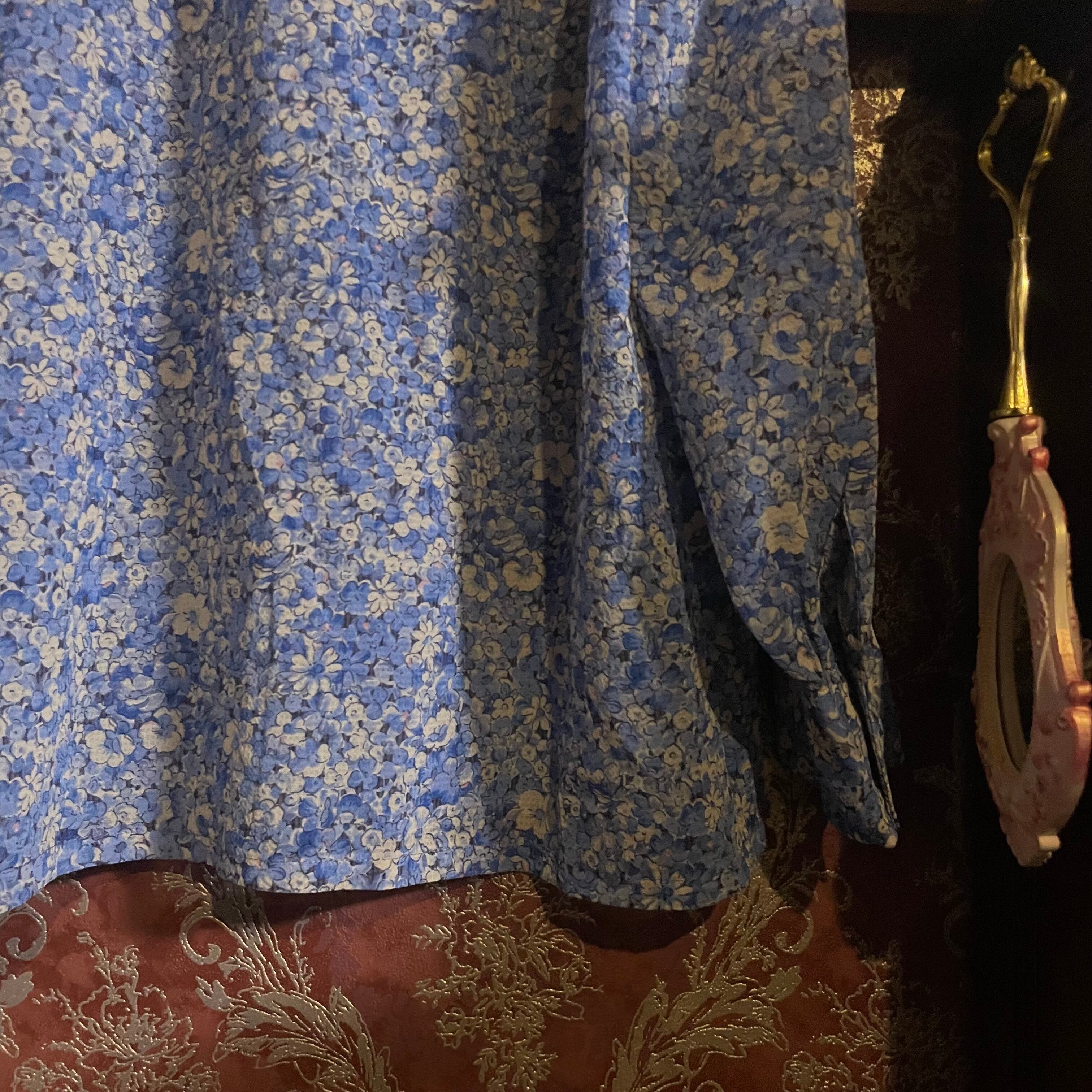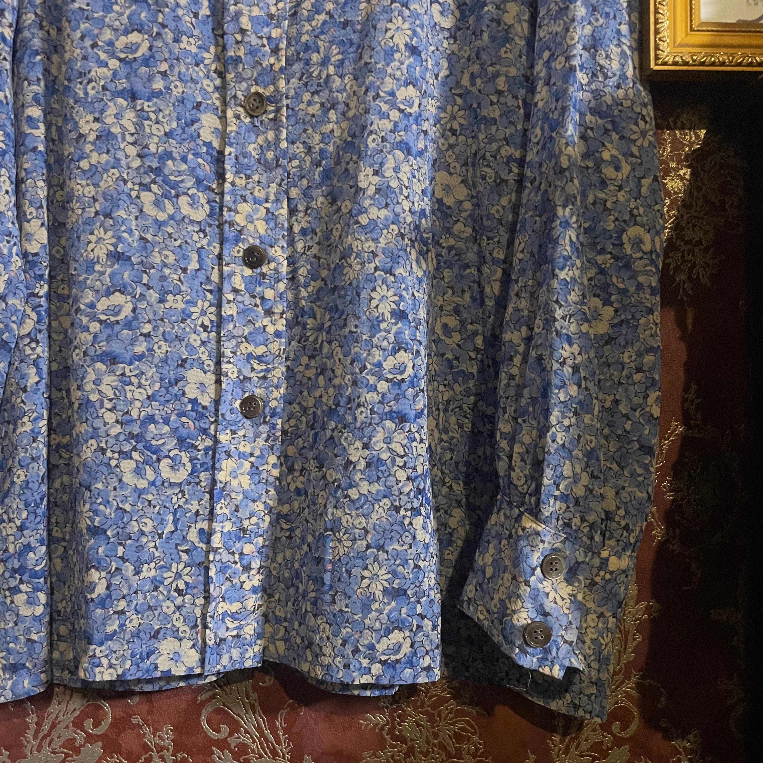 青の花が敷き詰められたエレガントなヴィンテージブラウスです。