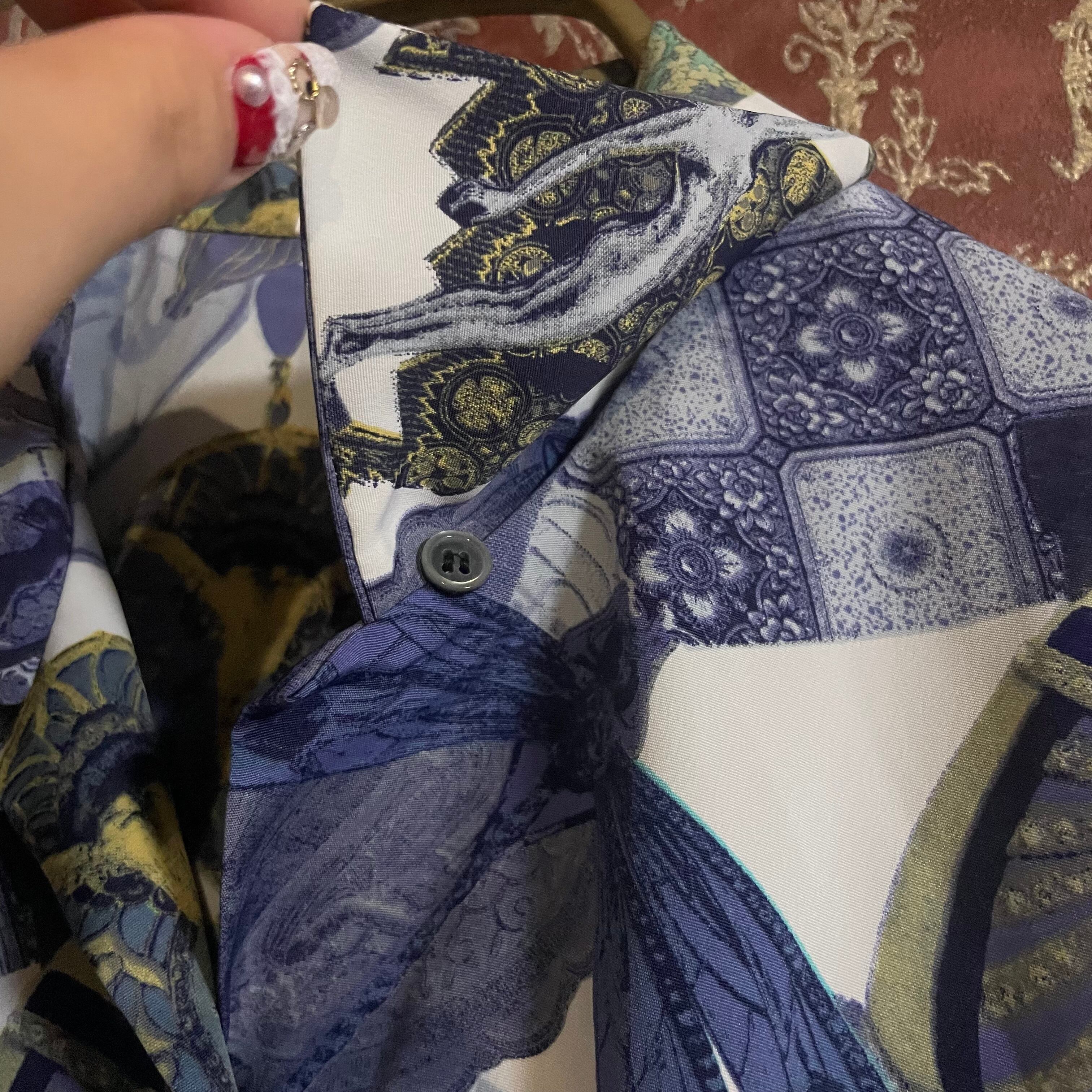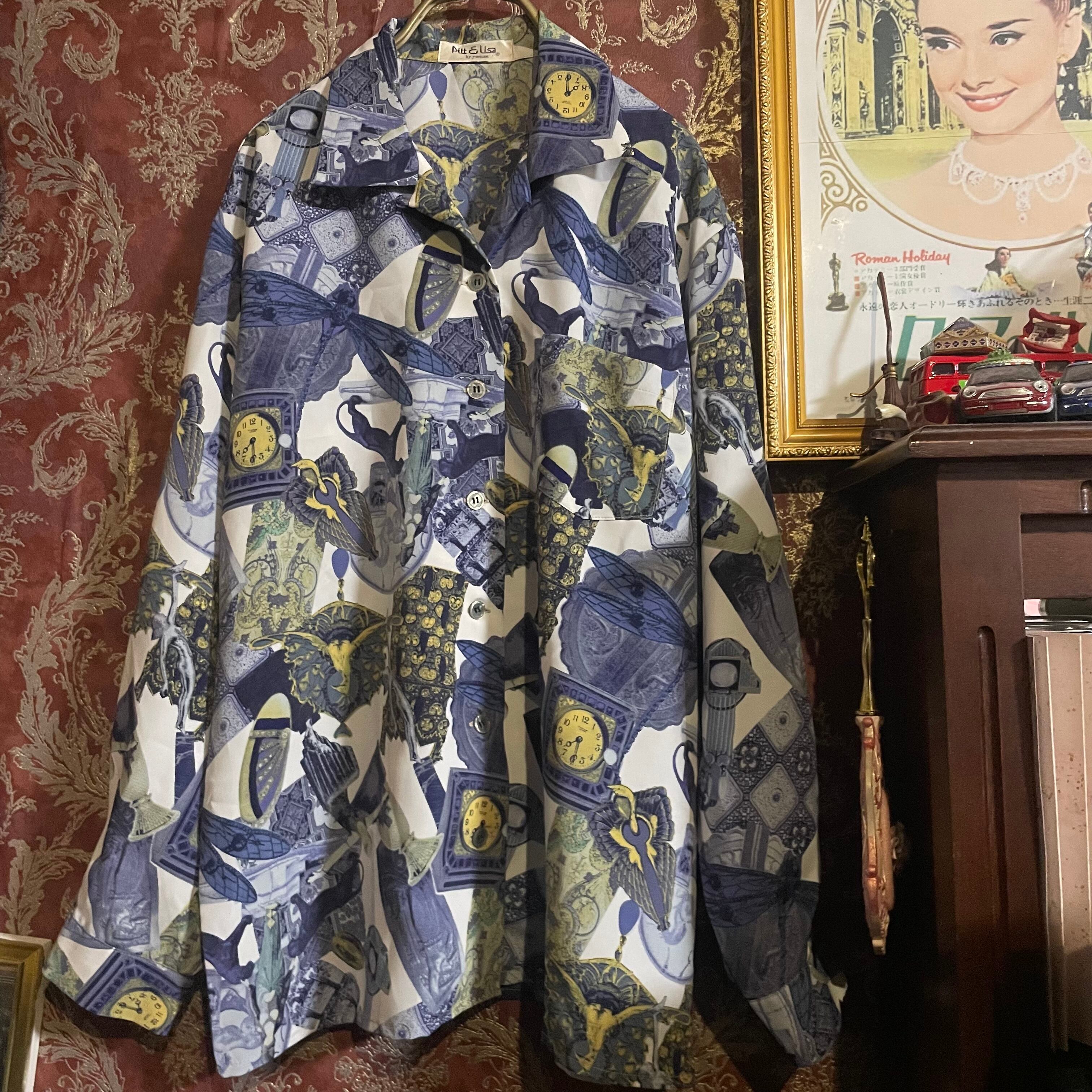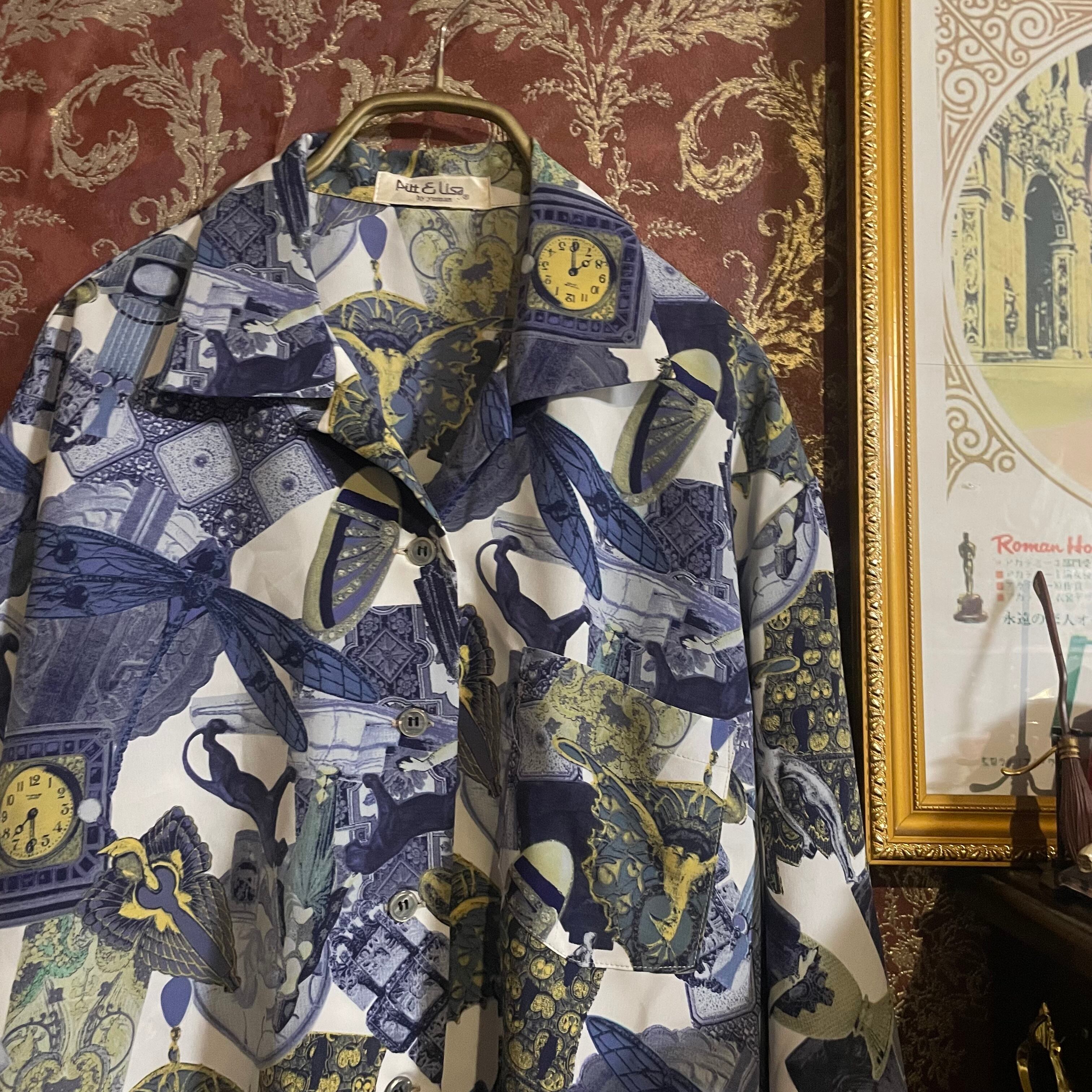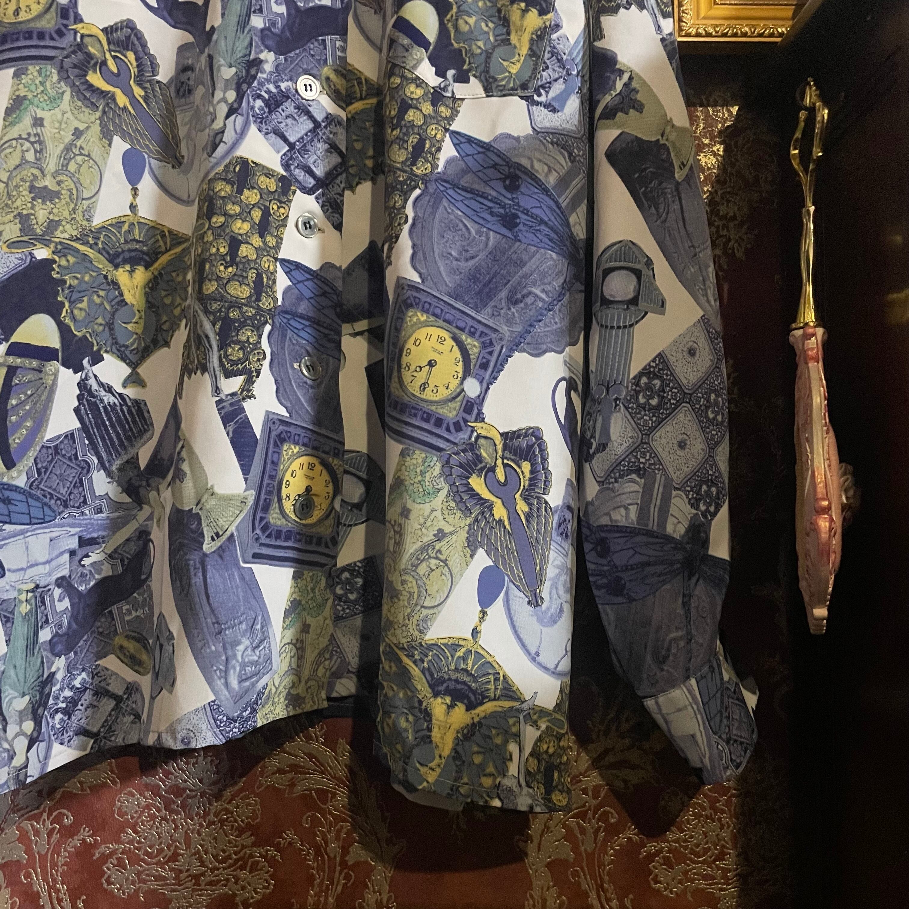 時計や彫刻、トンボのイラストが施されたユニークなデザインが、着る人の個性を引き立てます。