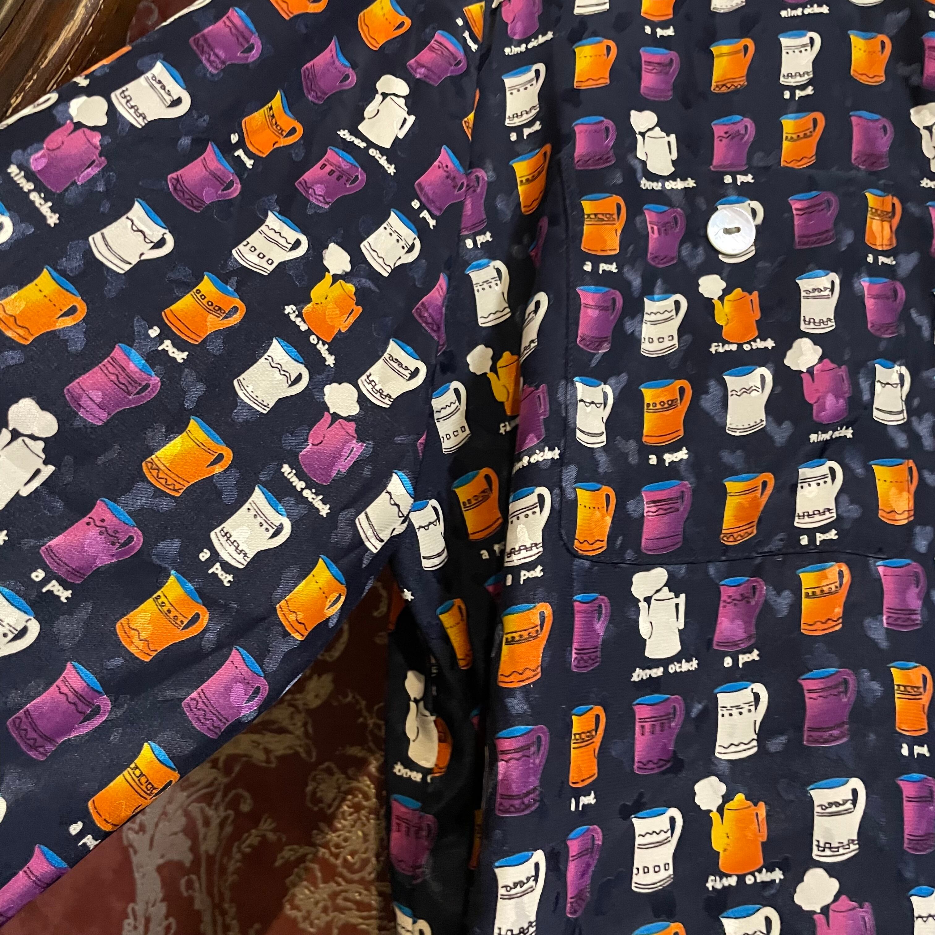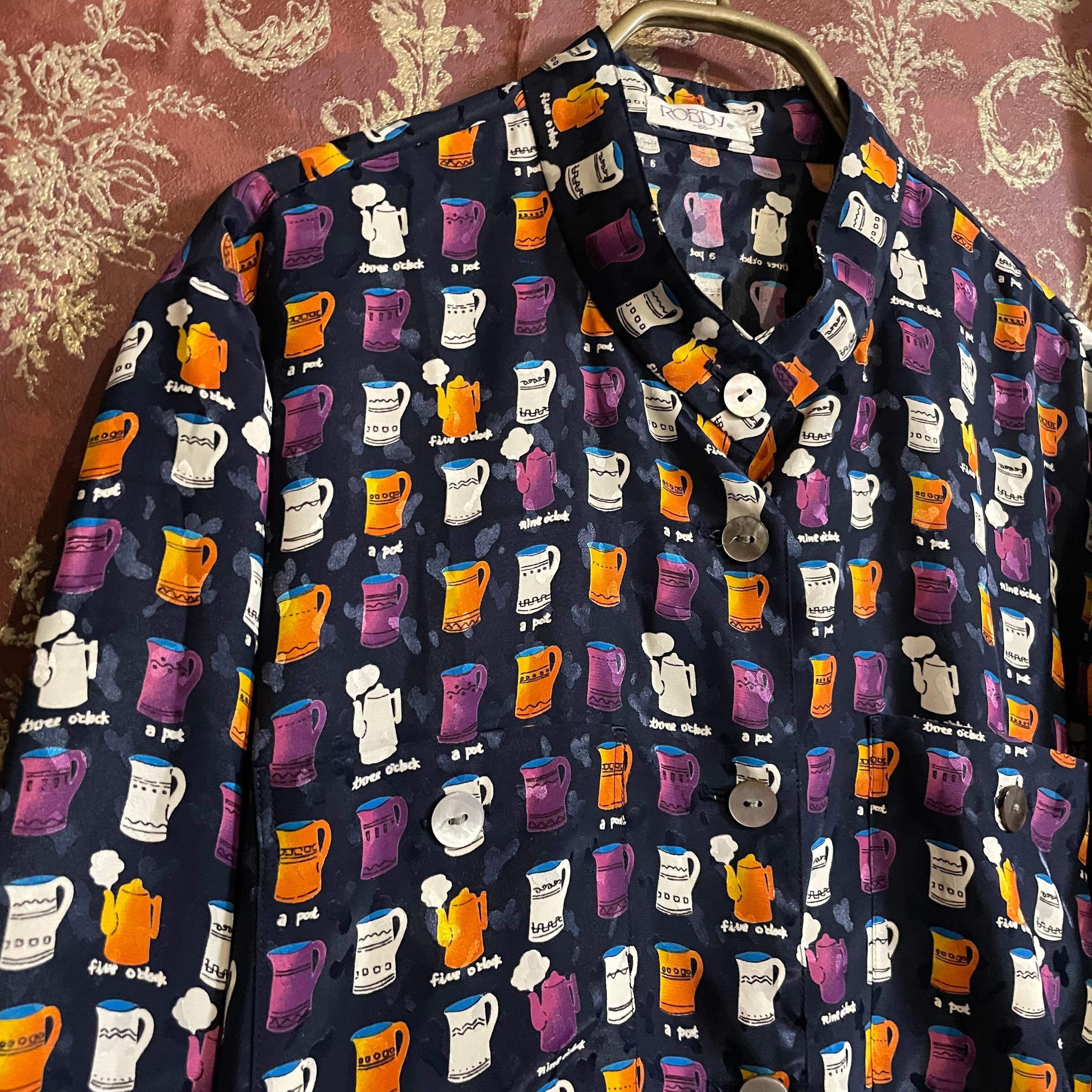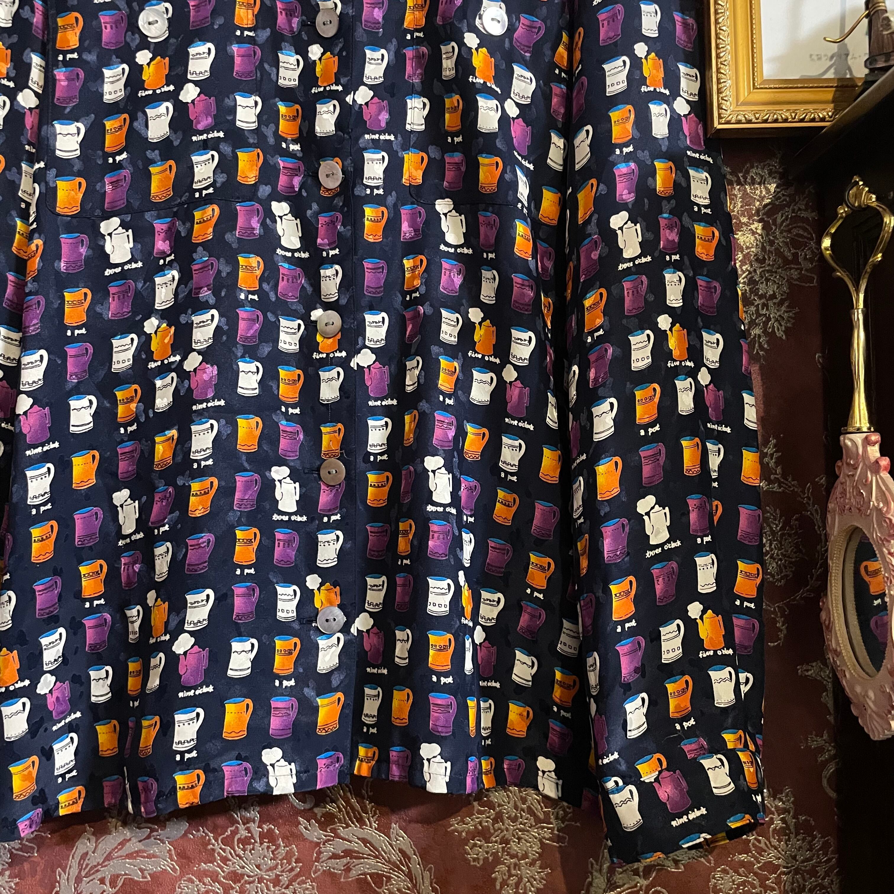 紺色を基調とした長めのポット柄が目を引くブラウスです。