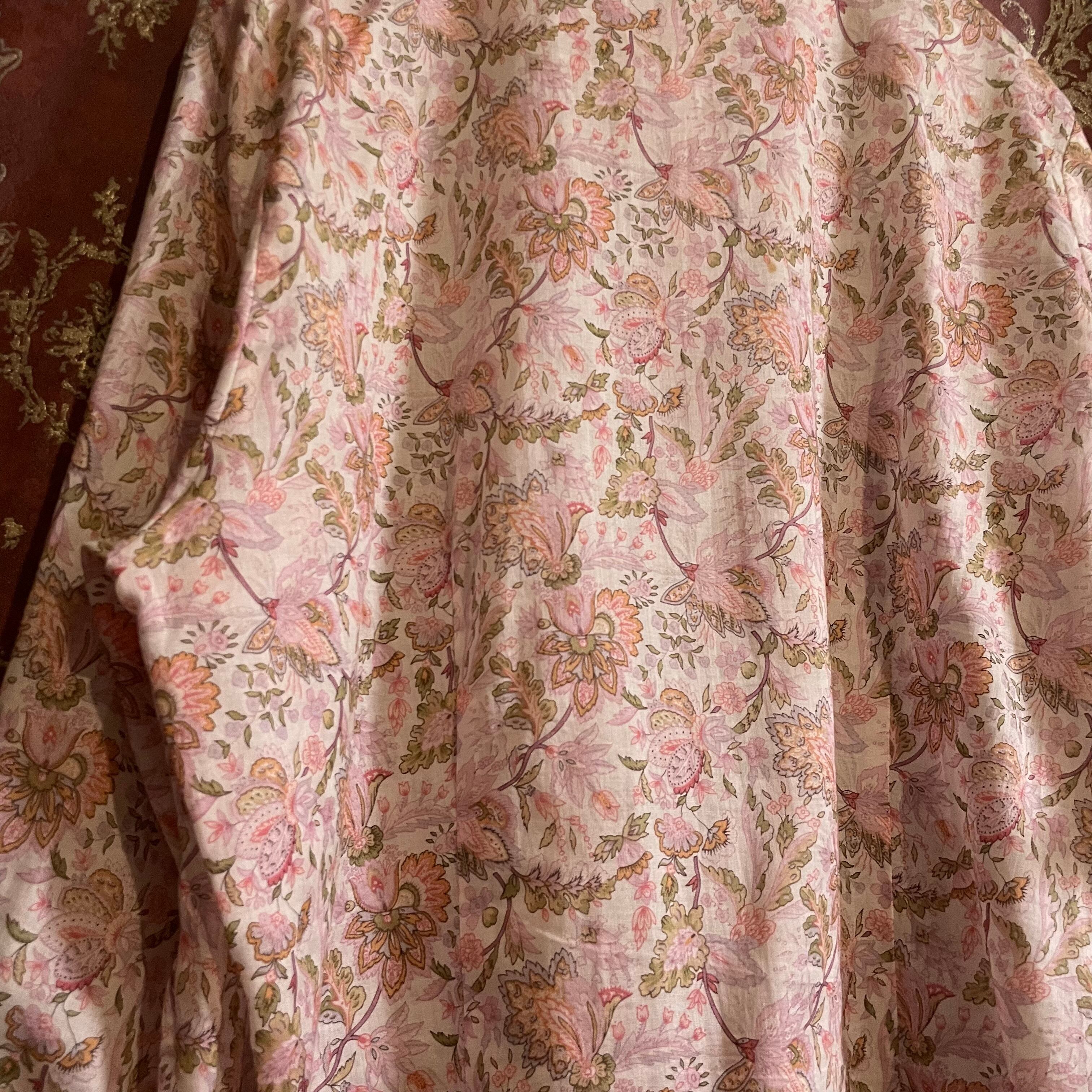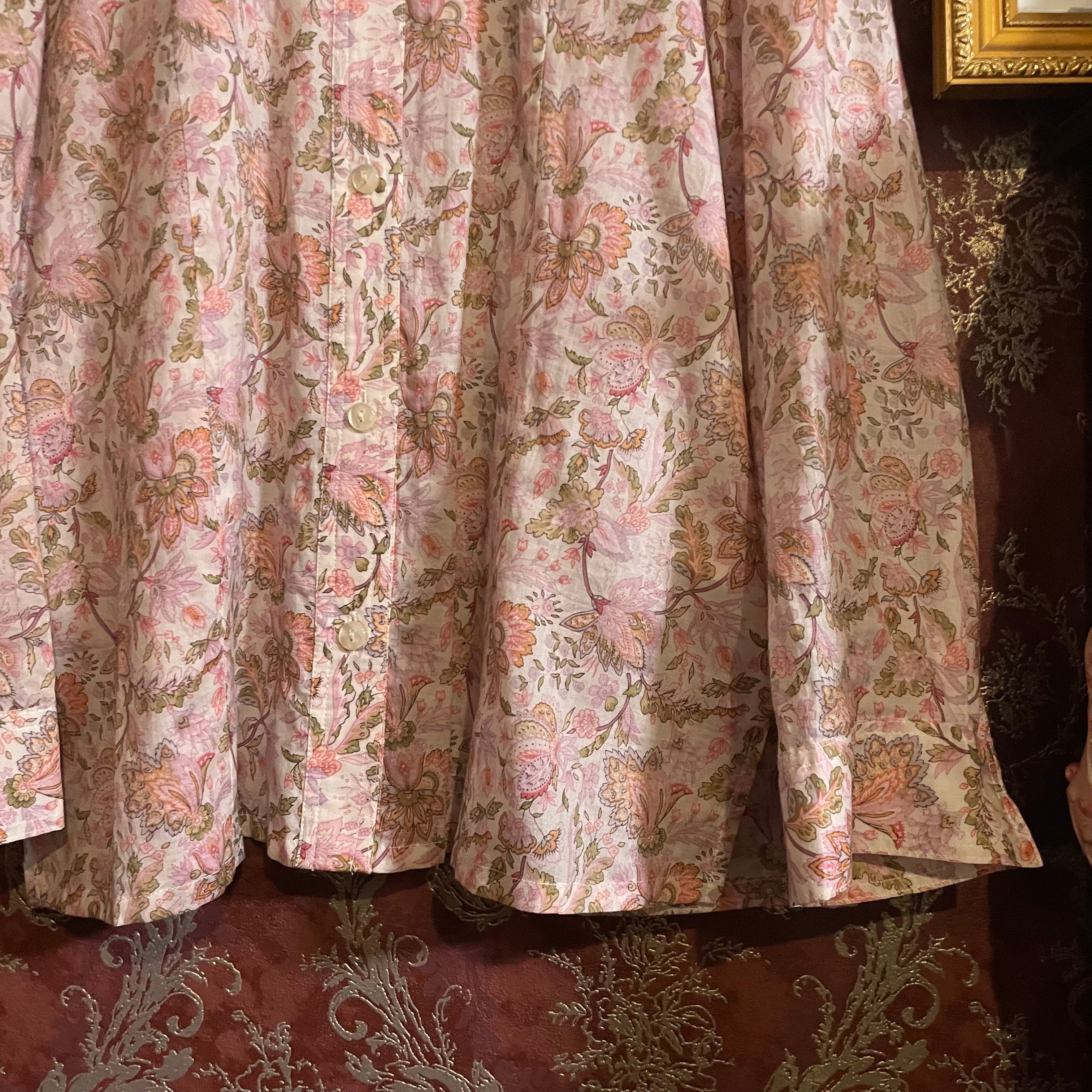 白を基調にした柔らかな生地に、可憐なピンクの花柄ブラウスです。