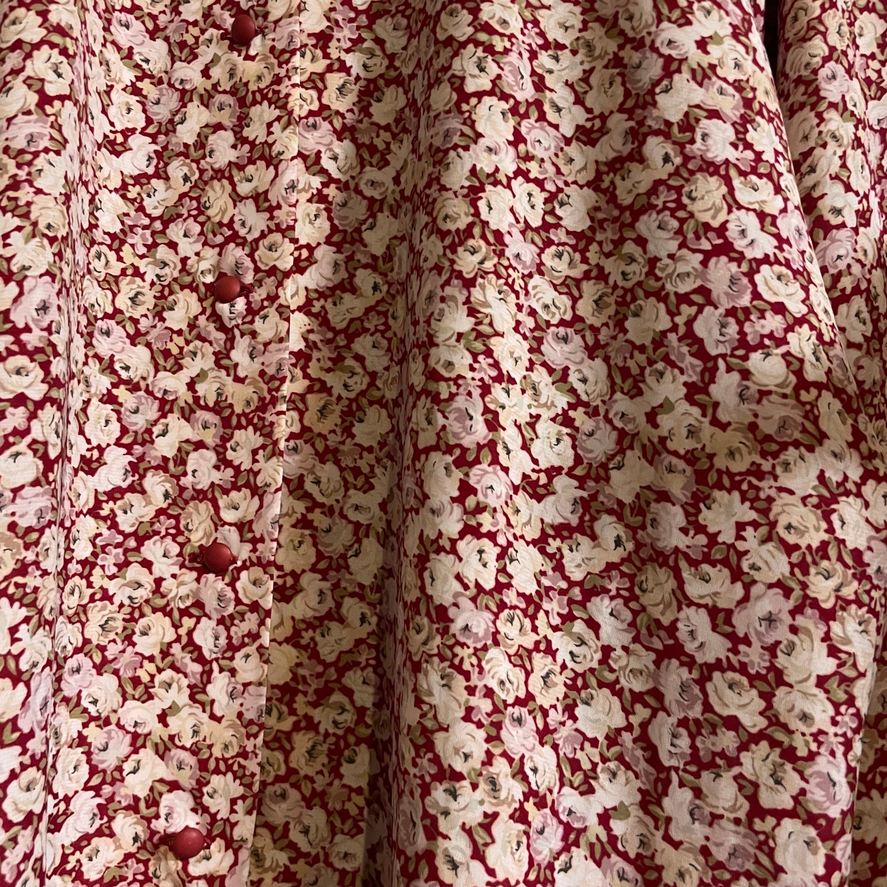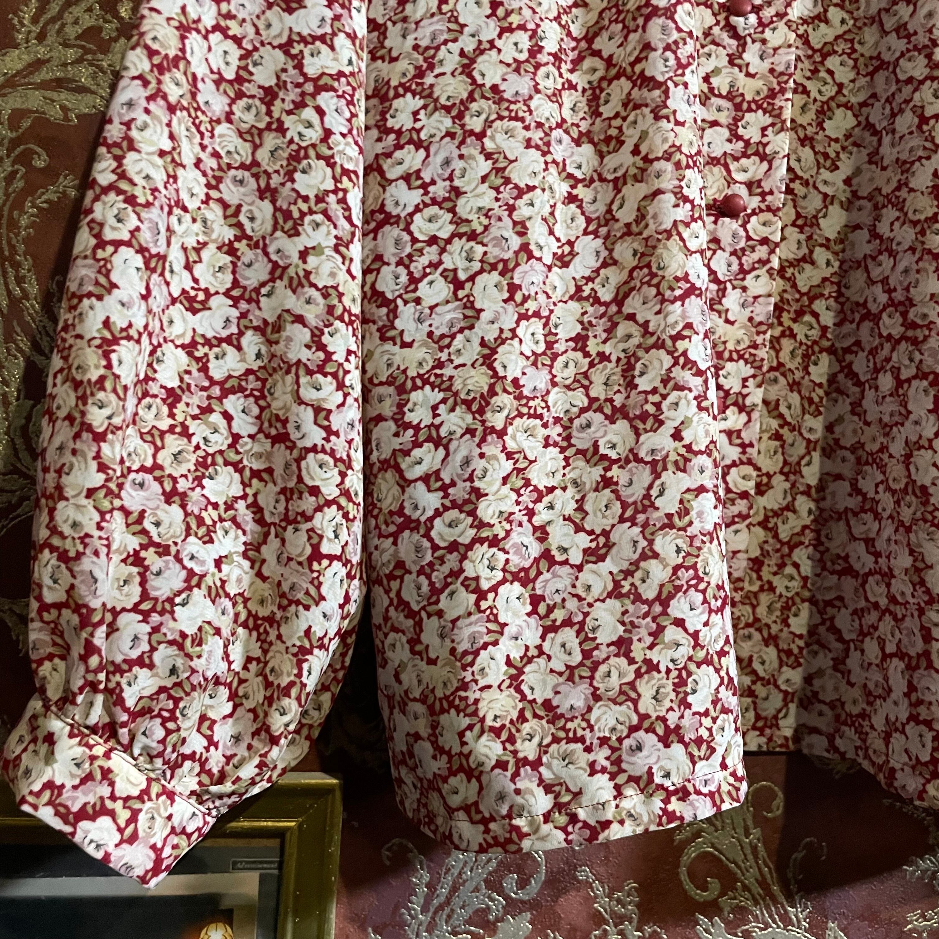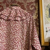 赤を基調にした白いバラ模様が魅力的なラッフルカラーのブラウスです。