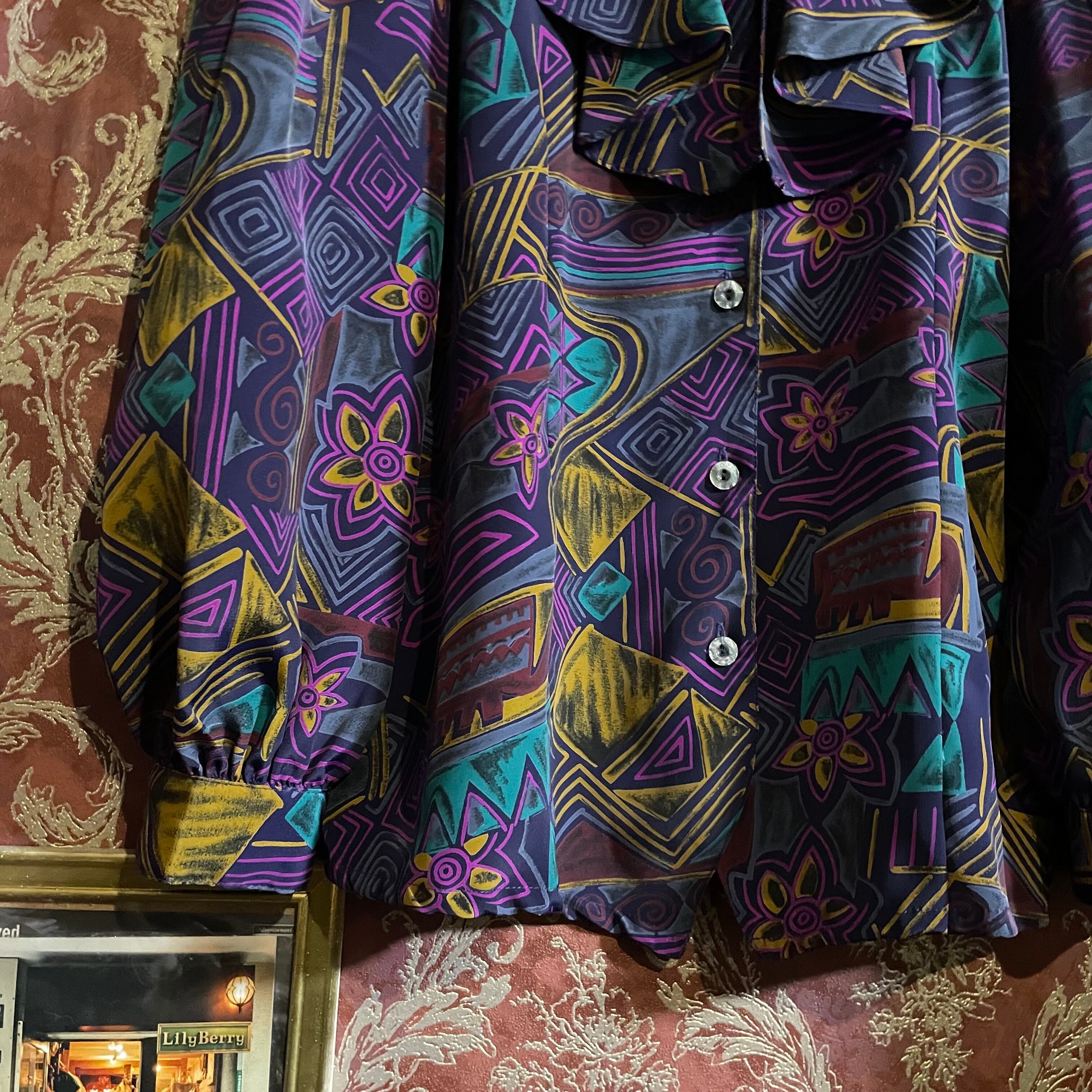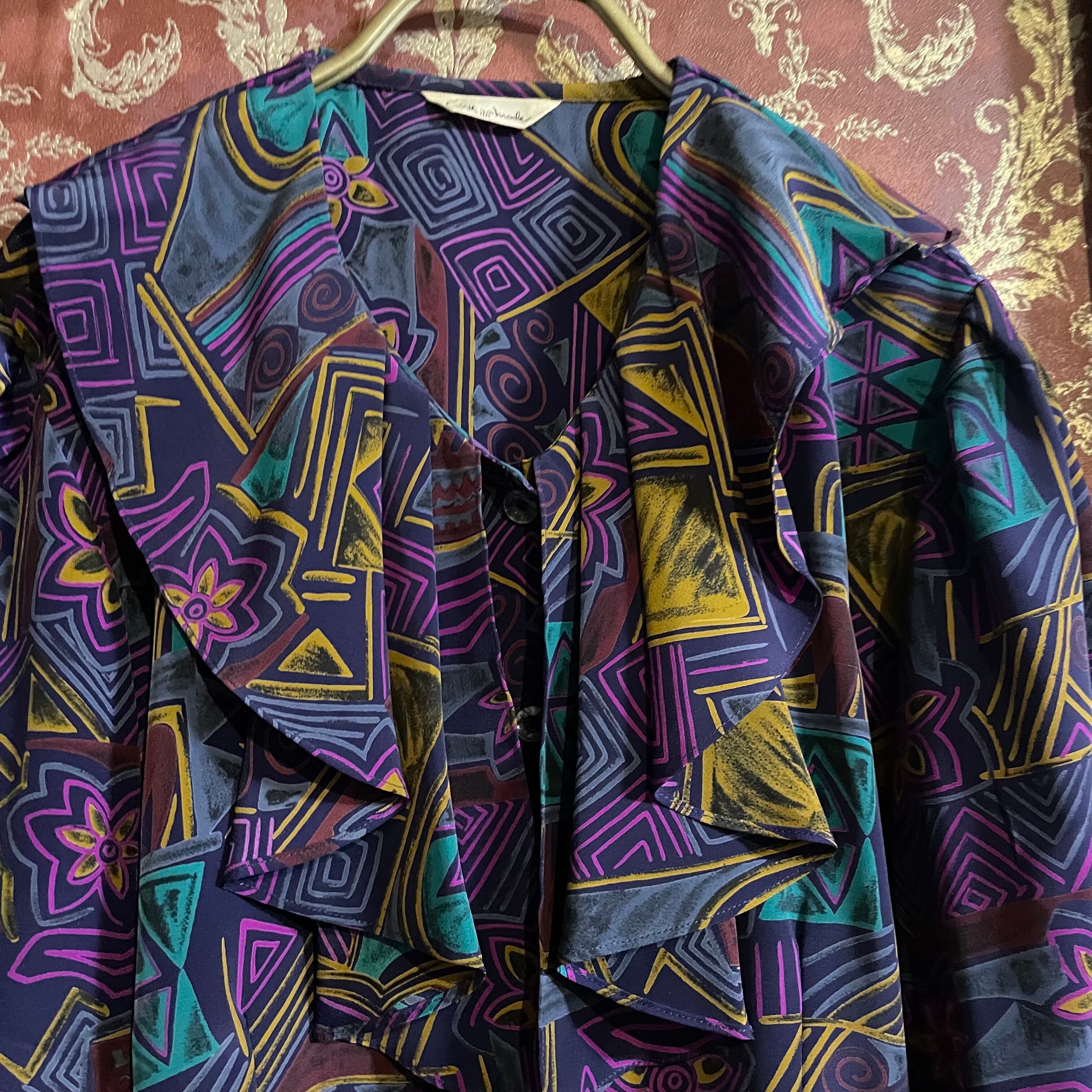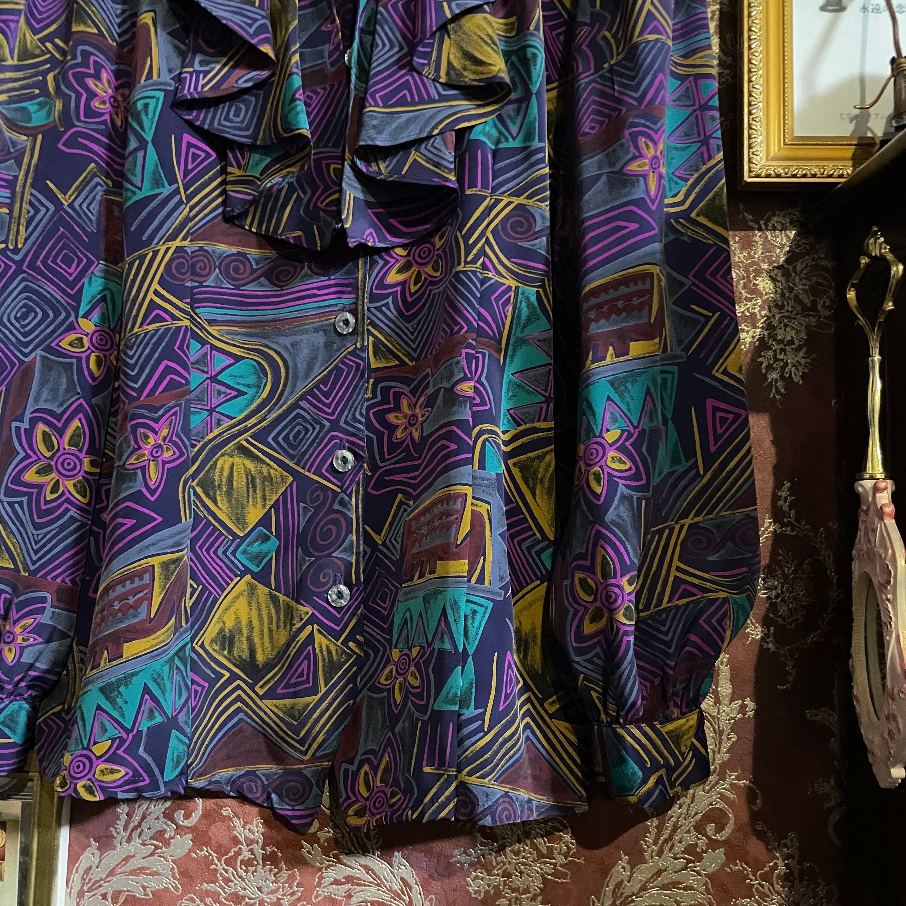 ダークなカラーを基調にアートな柄が魅力的なラッフルカラーのブラウスです。