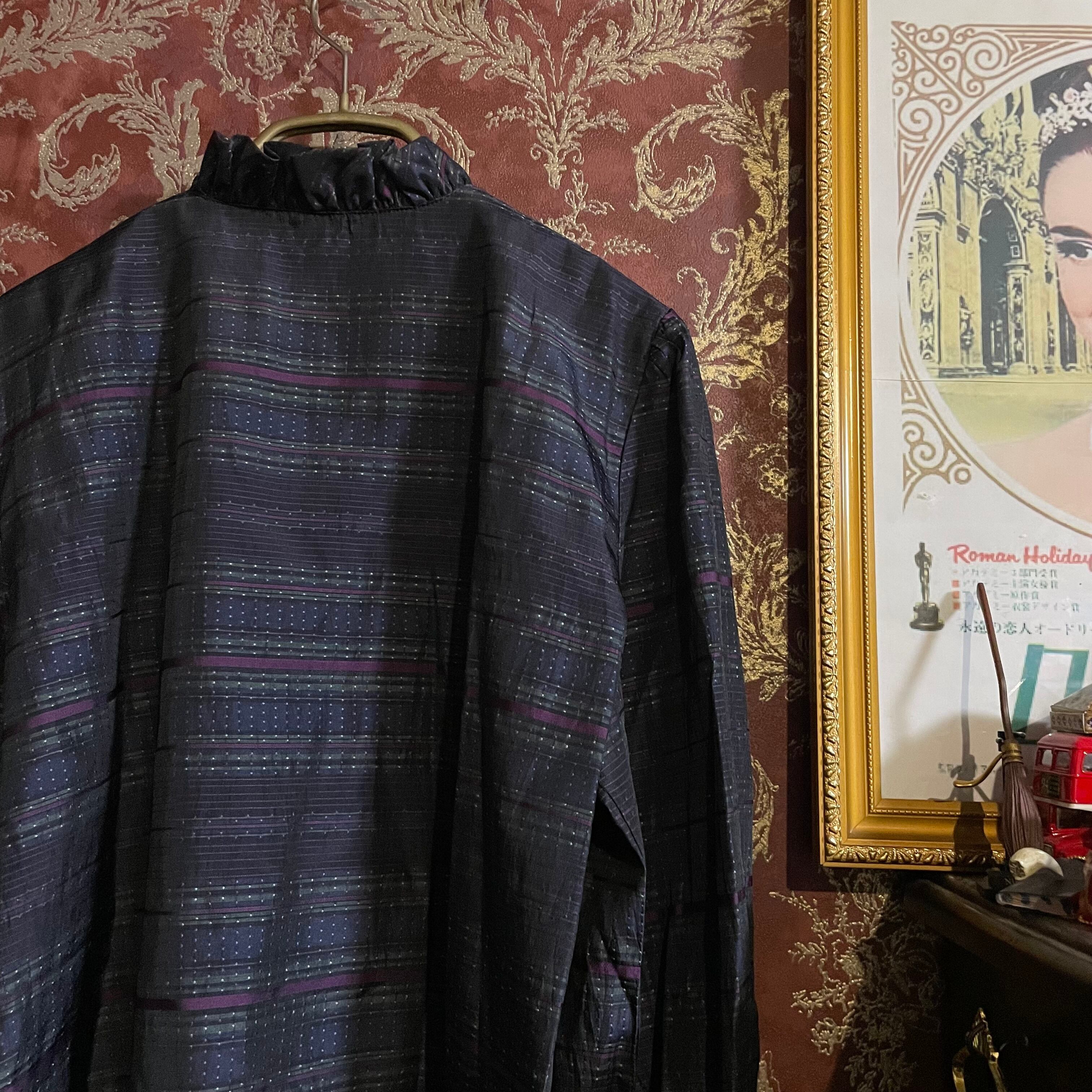紺ををベース、控えめなトーンのマルチストライプとピンドットのジャガードが魅力のブラウスです。